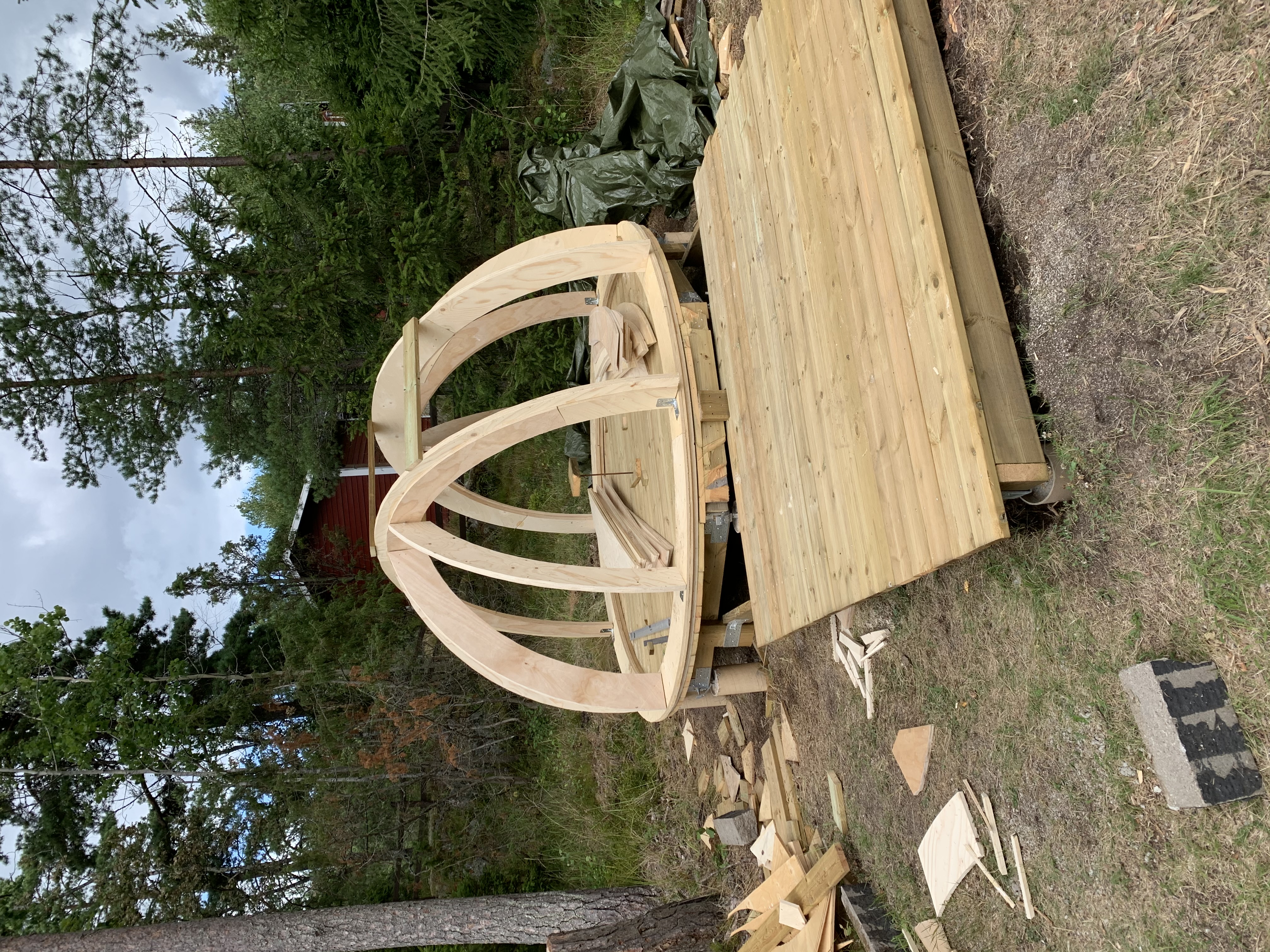 Efter regelstommen blev klar skruvade jag fast trätrall som jag sedan sågade med sticksåg för att få cirkulär. Stommen med trall har jag sedan kunnat använda som arbetsbord för att såga och limma alla bågar. Samtliga bågar utgörs av två lager 15 mm plywood som limmats ihop. Bredd på bågarna är 20 cm.