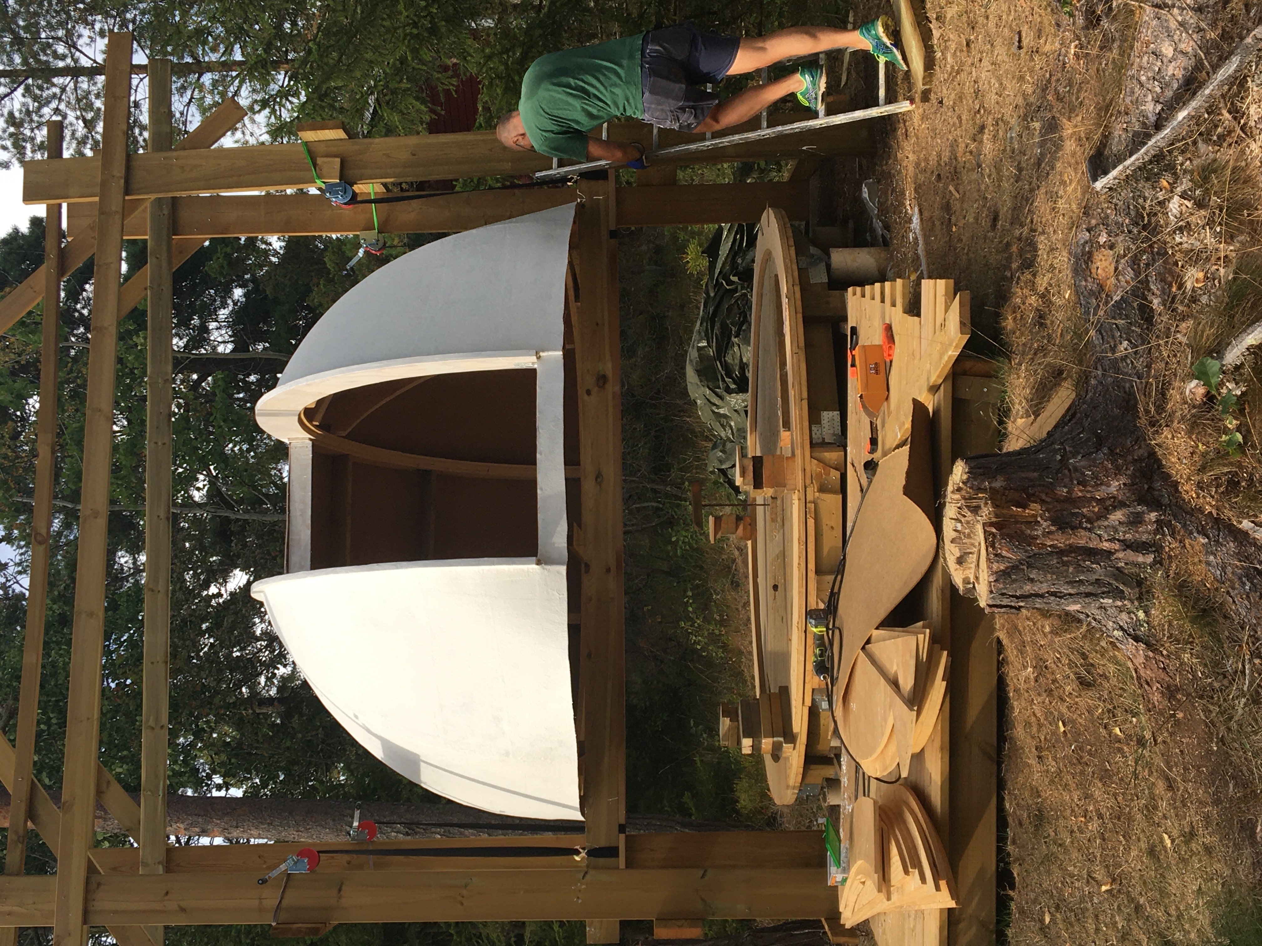 Jag beslutade mig i början för att bygga kupolen först, på marken, så det skulle vara enkelt att jobba på den (inga stegar etc). Tanken var sen att ta hjälp av några vänner för att lyfta upp den på reglar som skulle utgöra själva underdelen. Kupolen blev dock så pass tung att det verkade omöjligt att lyfta den för hand. Kände mig därför tvungen att bygga en ställning där jag kunde använda vinschar för att lyfta. Tog en hel del tid så om jag skulle ha gjort om det hade jag nog byggt underdelen först och sen kupolen ovanpå.