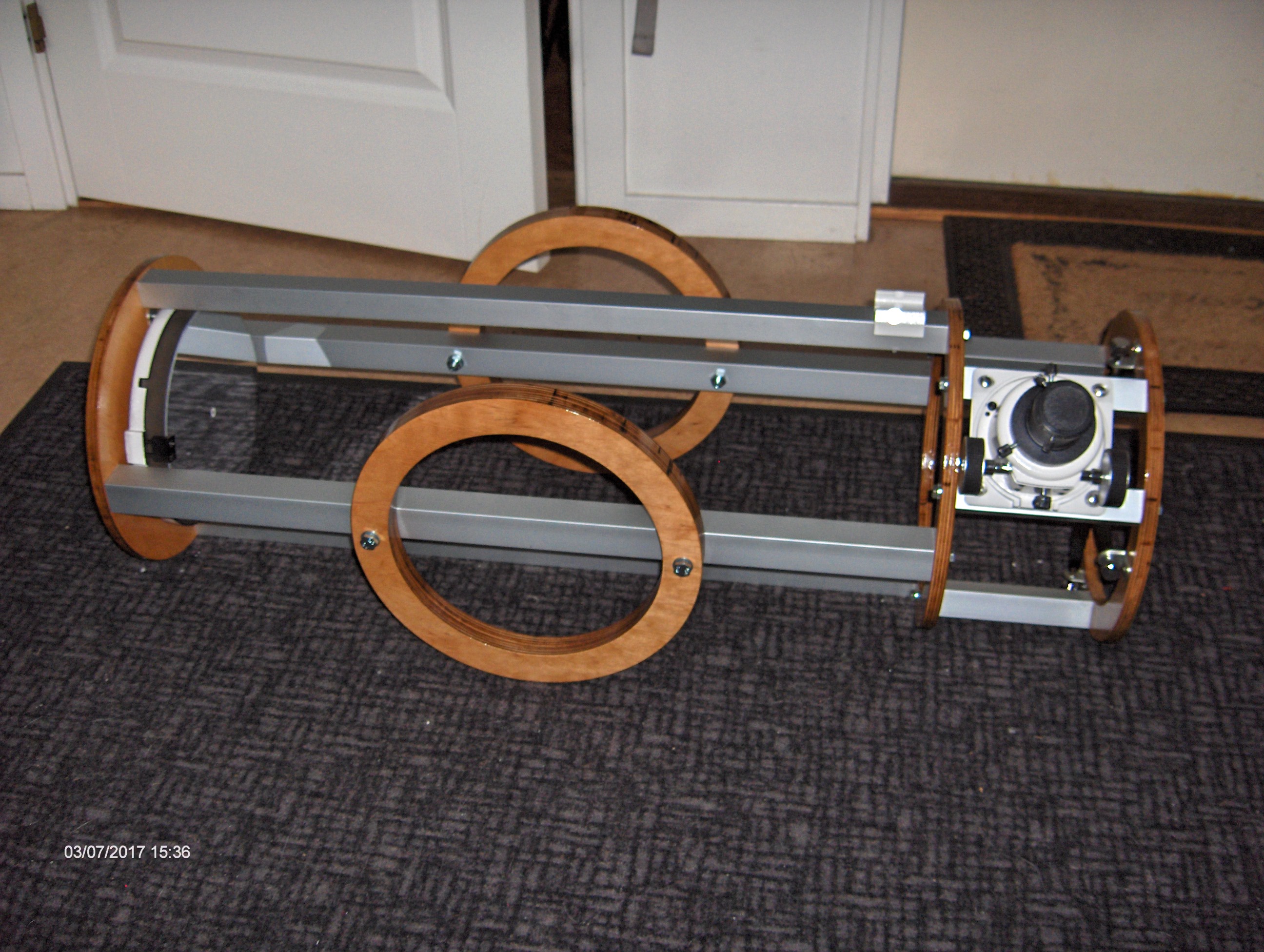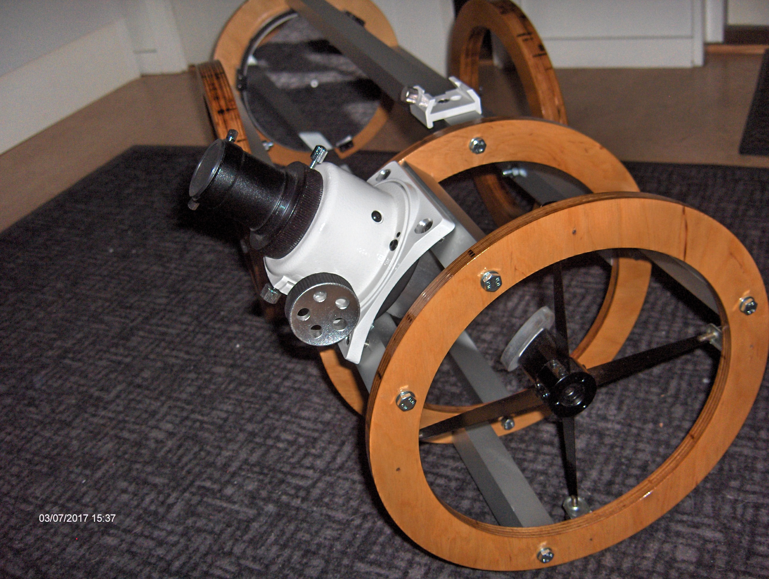 Teleskopet väger 13,7 kg inklusive sökare men utan okular. Det är mer än vad jag trodde från början men ungefär vad jag trodde att det skulle bli när jag var klar med tuben. Jag gjorde då en överslagsberäkning av vad rockerbox och pall skulle komma att väga.