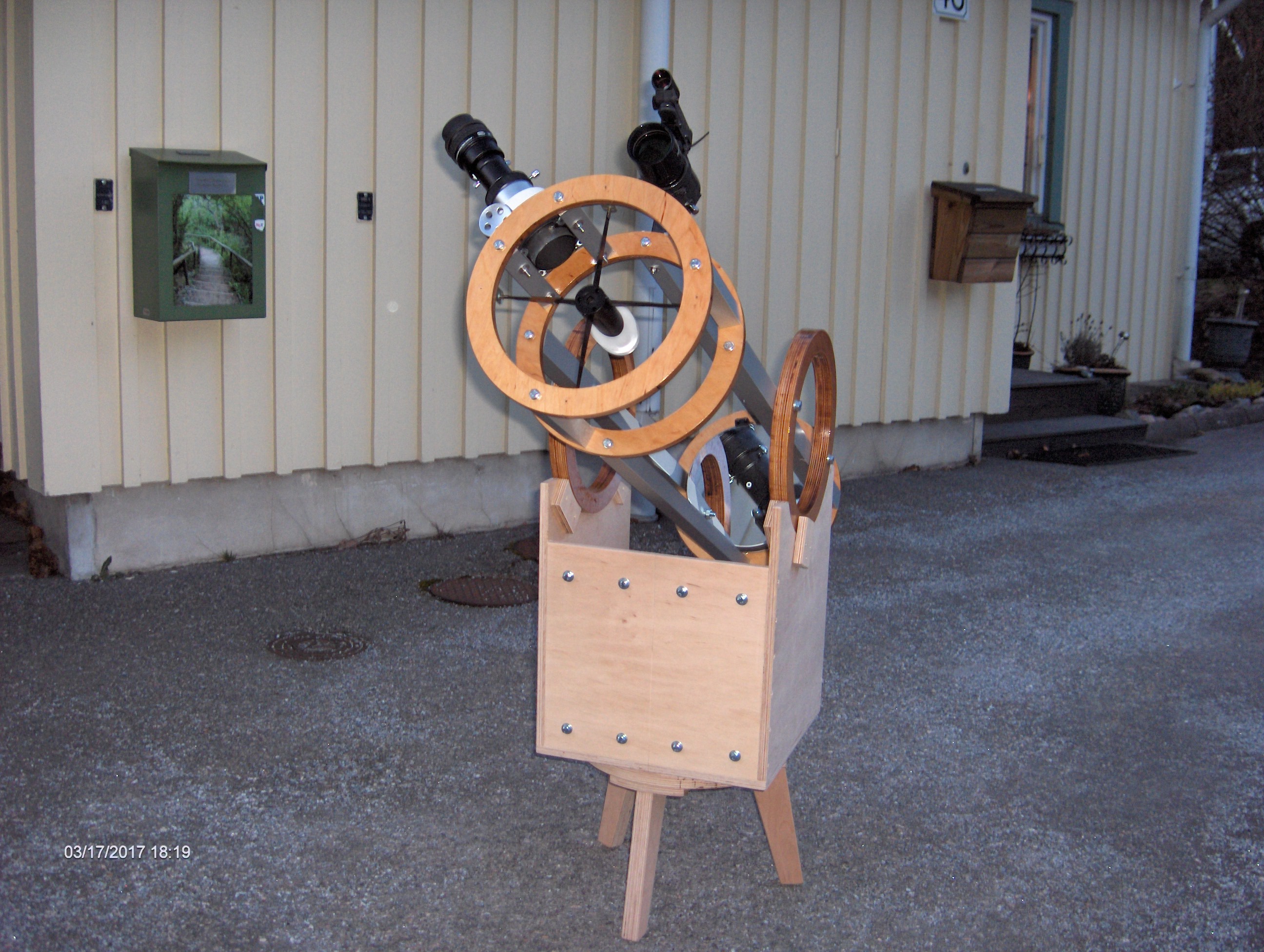 Ser mycket intressant och gediget ut! Tycker det känns som om du fått med alla saker som gör ett bra teleskop: rejäl spegel (8 tum), gott fokalförhållande (f/5), bra sökare (vinklad 8x50), ordentlig fokuserare, osv, osv. Precis som jag skulle vilja ha ett reseteleskop. Blir det en ljuskappa också? Väger ju obetydligt och skyddar bra mot ströljus.