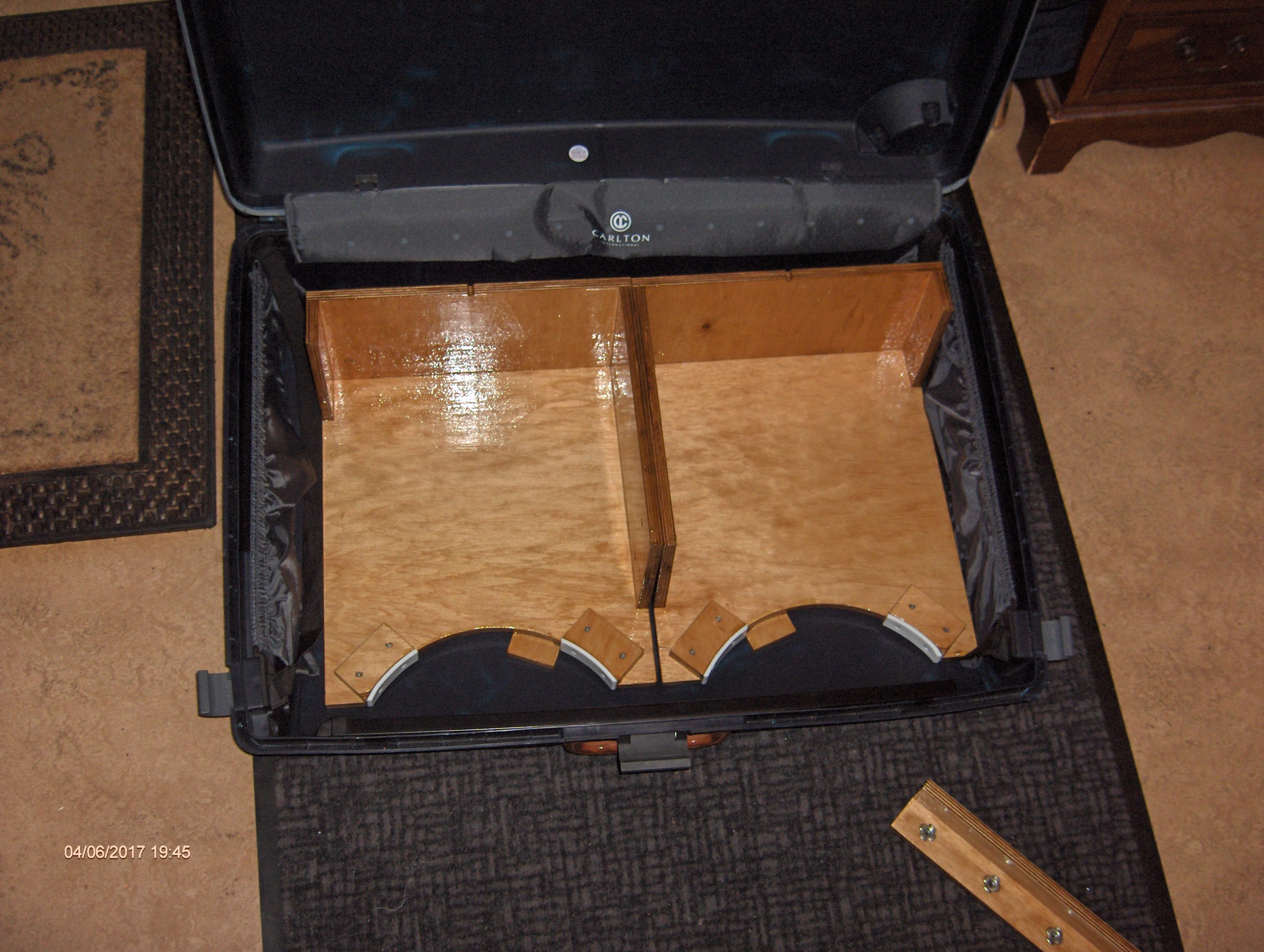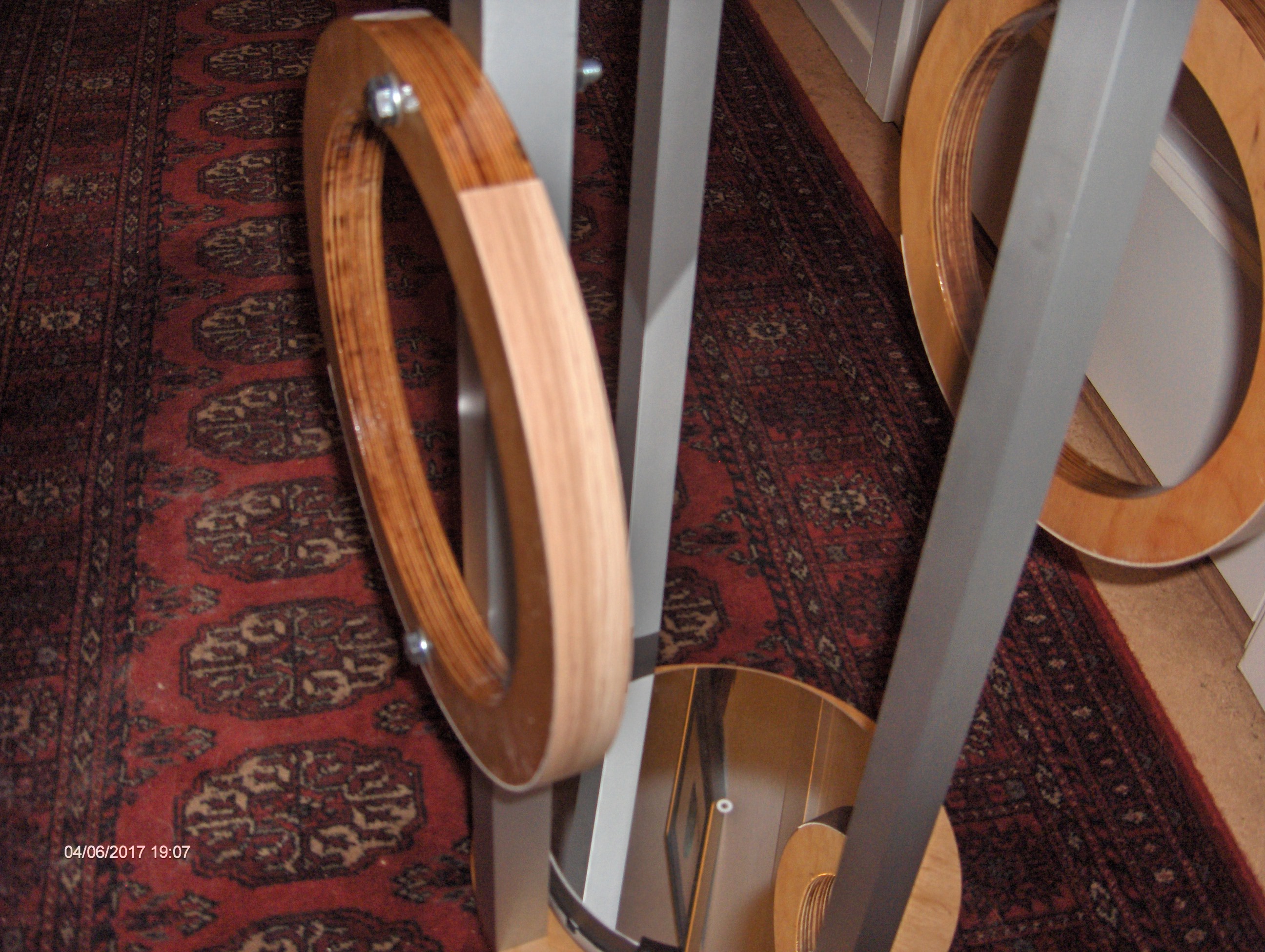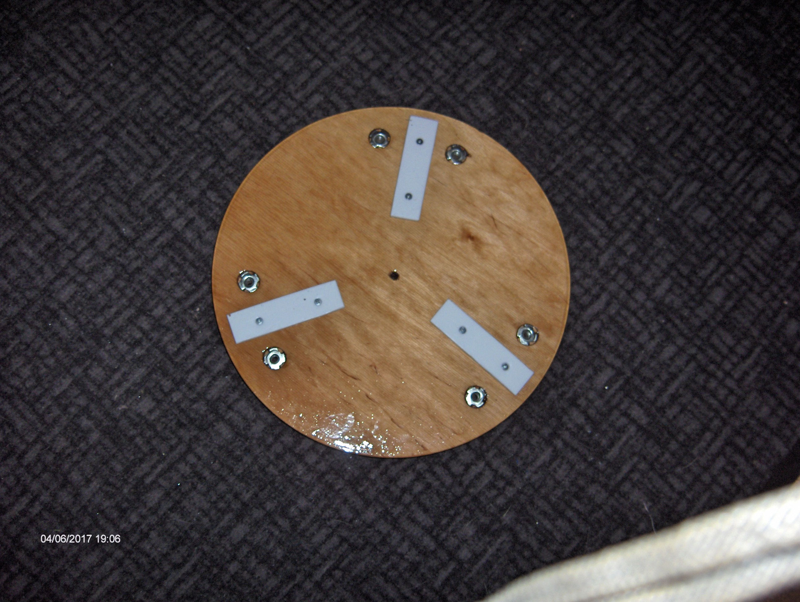Nu är min resedobson klar! Patrik tittade in igår och allt blev färdigt även om det krävdes en extra raid till Bauhaus. Laminatet skars till och limmades på höjdhjulen genom att värmas på med strykjärn och teflonbitarna sattes på plats med dubbelhäftande tejp och små skruvar på rockerboxen, och på den trebenta pallen som utgör underdelen av teleskopet. Teflonklossarna på pallen löper mot en gammal LP-skiva under rockerboxen.