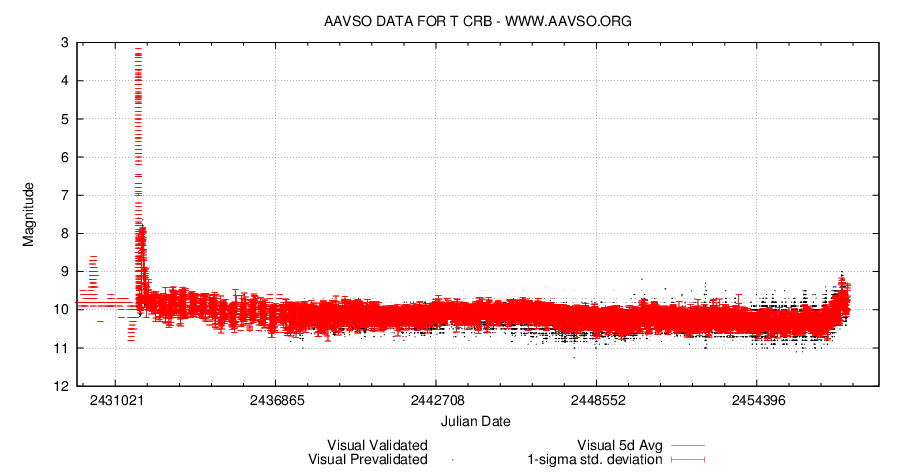 Nedanstående diagram från AAVSO omfattar åren 1940-2020. Den röda kurvan visar ljusstyrkans utveckling i visuella våglängder. Frågan är alltså om den nuvarande aktiviteten signalerar att ett nytt utbrott är på gång. Det är en fullt realistisk tanke. Efter utbrottet 1866 dröjde det nästan 80 år tills ett nytt utbrott inträffade (år 1946). Nu har ytterligare drygt 70 år passerat ...