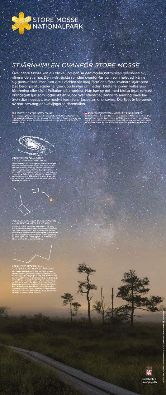 Jag hade under förra året ett uppdrag åt Länsstyrelsen i Jönköpings län att fotografera ett antal motiv i Store Mosse nationalpark, för att användas på nya informationsskyltar mm runt om i parken. Eftersom kontaktpersonen på Länsstyrelsen sett en del av mina astrofoton tyckte han att det vore en bra idé att lägga till ett motiv - Vintergatan över Store Mosse. Hans tanke var att vi kunde få med dels lite allmän information om vår galax och natthimlen och dels information om ljusförorening och de skadliga effekterna av denna.
