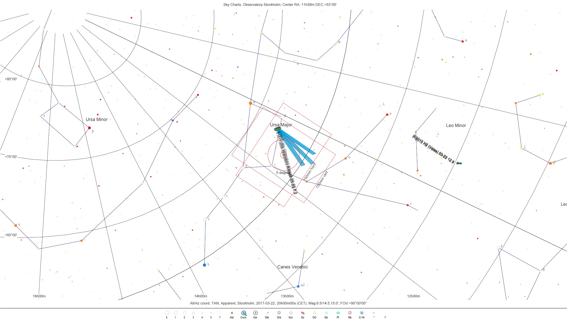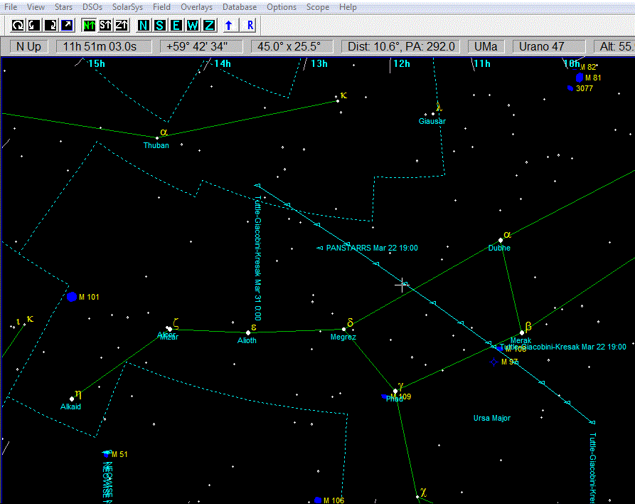 Jag noterar att SkyCharts-kartan ovan visar positionen för 41P åtskilliga grader fel. Bifogar banan för komet 41P/Tuttle-Giacobini-Kresak med början från 19 mars klockan 0 svensk normaltid med 1 dygns mellanrum. Sista positionen är för 31 mars. På onsdag kväll (22/3) passerar komet T-G-K M108 och M97 (Ugglenebulosan). Ett fototillfälle!