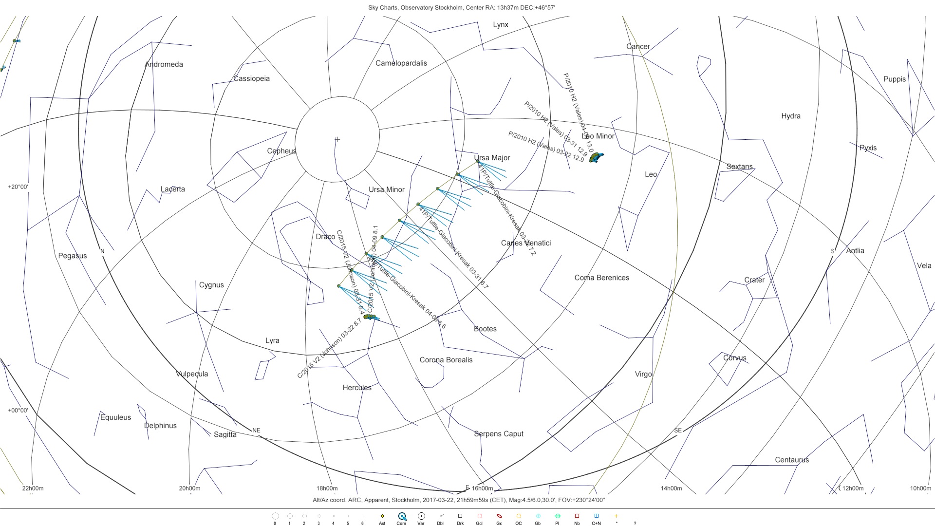 Den är ritat hur det ser ut från Stockholm ikväll kl 20, 22 mars-2017. Kometens läge var tredje timme från kl 20.