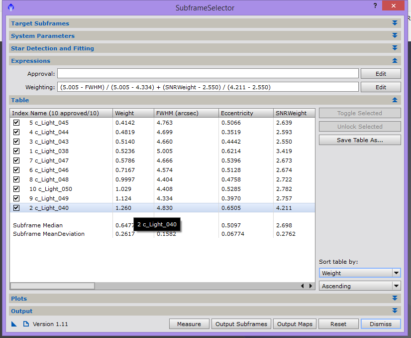 Mät alla bilder. Då skapas det en tabell med olika bildparametrar. Vi är intresserade av FWHM och SNRWeight. Om du inte guidar, behöver du kanske ta med Eccentricity, som anger hur avlånga stjärnorna är i bilden.