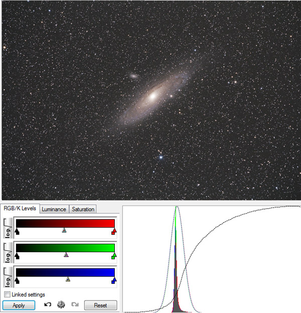 Färgbalansverktyget i DSS är riktigt bra (den enda användbara bildverktyget i programmet), jag börjar med ett ställa in +20% Saturation, och centrerar färgkurvorna i början av branten på kurvan. Ibland finjusterar jag sedan färgbalansen lite grann men oftast så fortsätter jag direkt i något annat bildbehandlingsprogram. Det finns en fördel med att man får en S-kurva på köpet eftersom det ibland finns en risk att man tappar data om man sparar den färdiga bilden (som internt representeras av 32-bitars flyttal) som 16 bitars heltal. Det går ju att också jobba med 32 bitars heltal men 16 bitars bilderna är ju stora nog som de är, speciellt om man jobbar med många lager och masker.