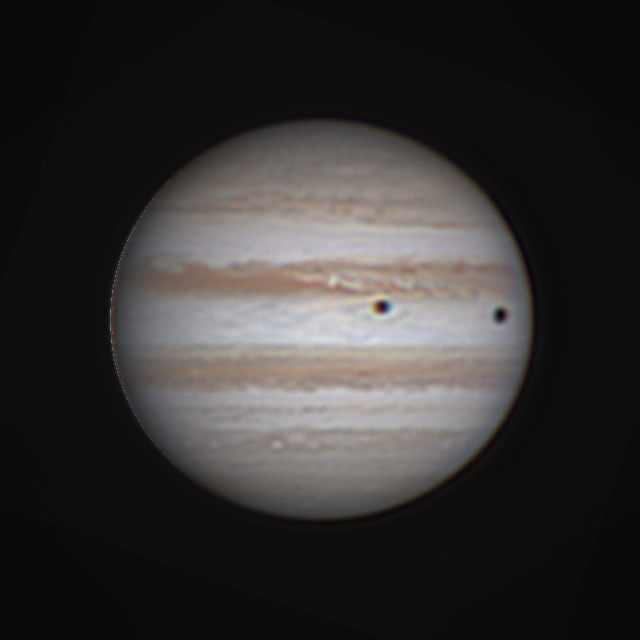 Kommentar: Jupiter med månskuggor . Först Io med skugga. Sedan den mörka Callisto och skuggan från Ganymedes.