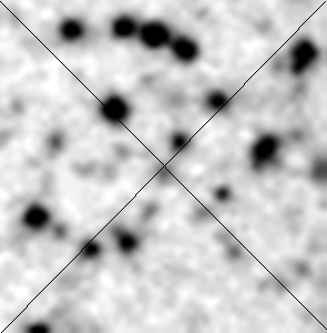Nedan ses ett utsnitt 1 x 1 bågminut, från en DSS-bild där jag i DSS Plate Finder som centrum lagt in VSX-positionen för V498 Vul: J195951.29+224232.3. Norr är uppåt. Det finns en svag stjärna mycket nära dvärgnovans position, men det osäkert om objekten är identiska.