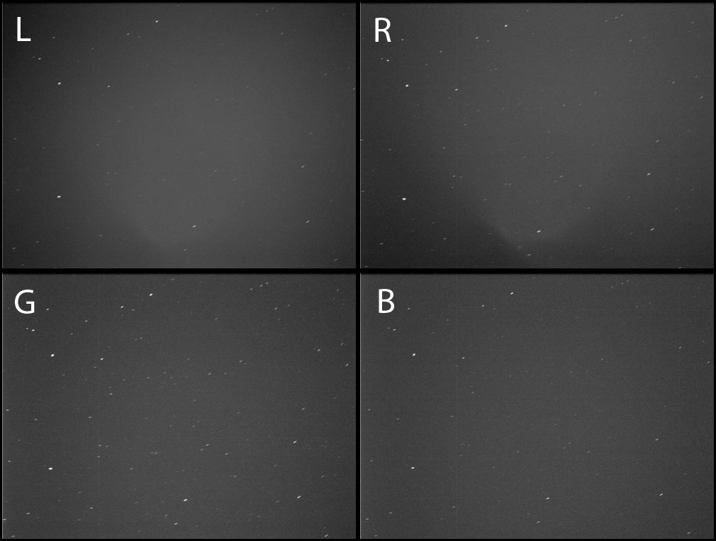 När jag var klar runt midnatt (då moln dragit in) så gjorde jag ett snabbt test med teleskopet i parkerat läge (ingen tracking igång) och tog bilder med samtliga filter. Där ser man att mönstret framträder på L och R filtren men inte på G och B.