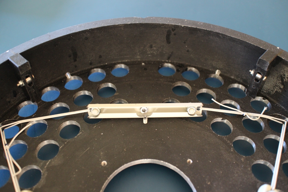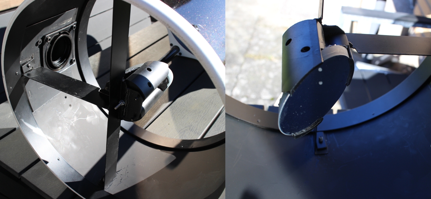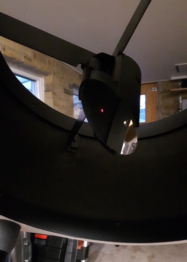 När jag skulle kollimera så upptäckte jag att en stor fördel med en truss tub är att man kan se sekundärspegeln och därmed få en mycket bekväm kollimeringsposition. Spegeln höll sig bra i sin cell. den föll snällt ner på sin plats efter att man fört den i sidled. Kantstöden har ca 0.5mm spel i höjd o sidled runt om. Där sitter ingen filtkudde eller något som kan ge friktion o spetslagerna har naturligtvis ingen tröghet så gravitationen gör sitt jobb.