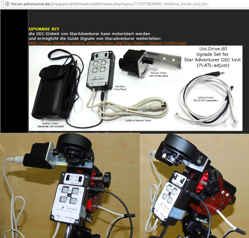 För att bli mer detaljerad i min frågeställning och svara på era fågor så är monteringen en Sky-Watcher StarAdventurer, ja, eller stjärnföljaren. Den har ju bara motor i RA. Men jag upplever att jag vill guida också i DEC och stötte på detta, som dock aldrig kom i produktion: