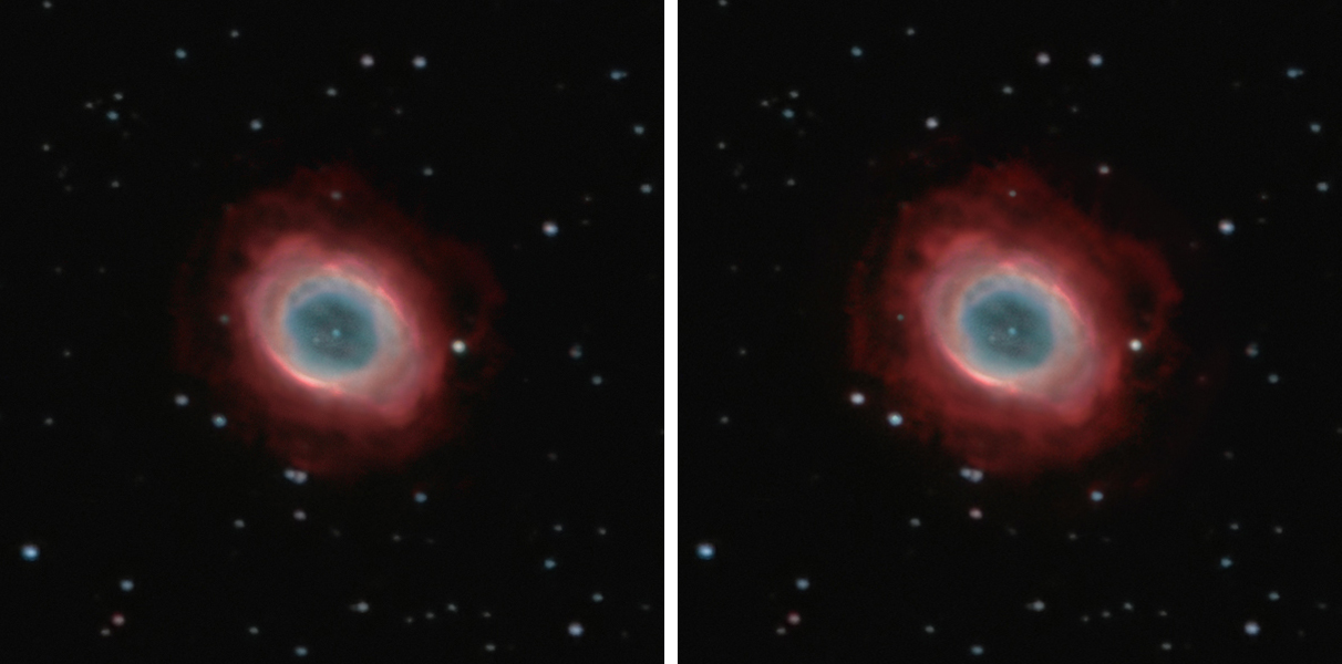 Den här gången tog jag ut bara den röda kanalen i H-alfa subbarna och stretchade dessa lite redan innan alignment/registrering och stackning. Sedan stretchade jag ytterligare och blandade in detta i den röda kanalen på version 1, det blev en hel del labbande här.