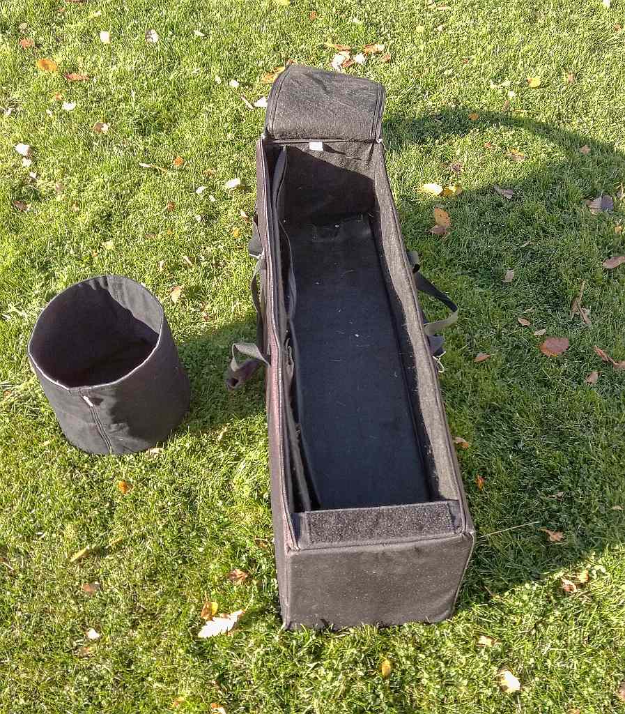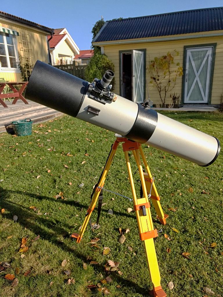 Teleskoptub: Intes Micro MN66 deluxe (huvudspegel av sital) med Baader Steeltrack-fokuserare, samt transport- och förvaringsväska. Data: öppningsdiameter 152 mm, brännvidd 952 mm, f/6,3. I botten av tuben finns ventilationshål, täckta av en löstagbar lucka.