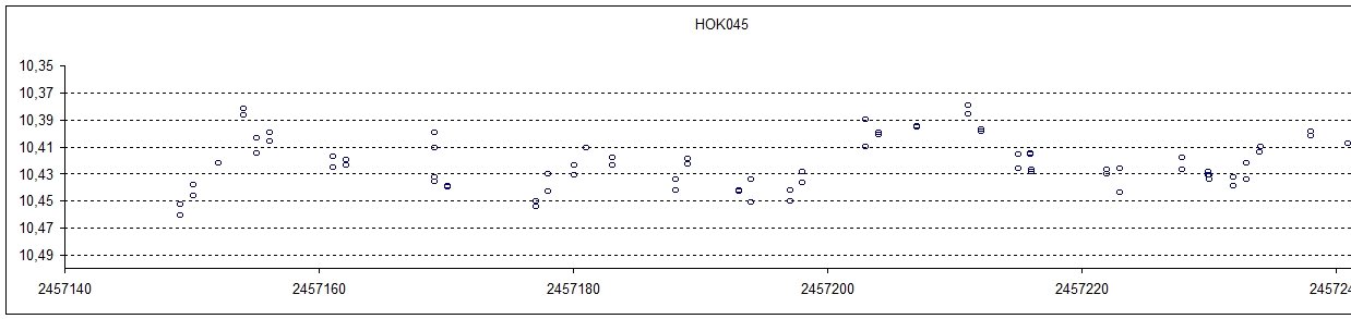 Fick av Thomas: "Den verkar ha en liten men tydlig variation. Typen verkar vara samma som de övriga vi hittat, gissar på SRB. Periodelementen fick jag till 2457017 + 37.08 * E"