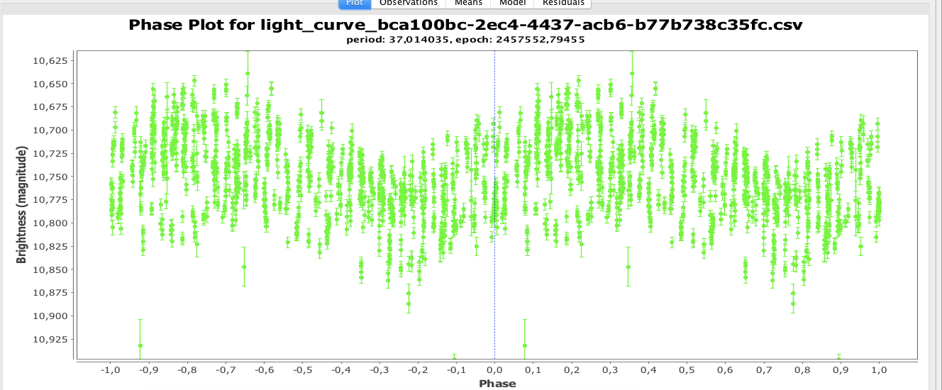 Katarina: Jag skrev en miniguide till Peranso högre upp i tråden. Startepok får man inte fram automatiskt utan man får testa sig fram med olika JD (under knappen i? Har inte programmet fram för mig nu) framåt i tiden efter första obsdatumet, som är förifyllt, så att toppen i ljuskurvan kommer på fas 1.0.