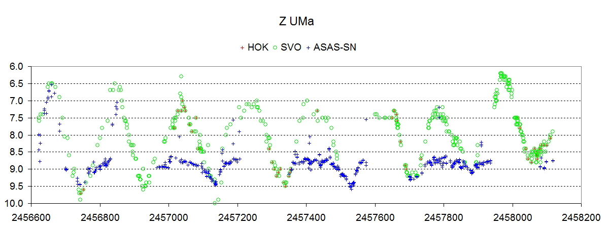 Diagrammet för Z UMa illustrerar väldigt tydligt att ASAS-SN kan användas bara för variabler som är svagare än visuell magnitud ca 10, dvs där vi drog gränsen i projektet.