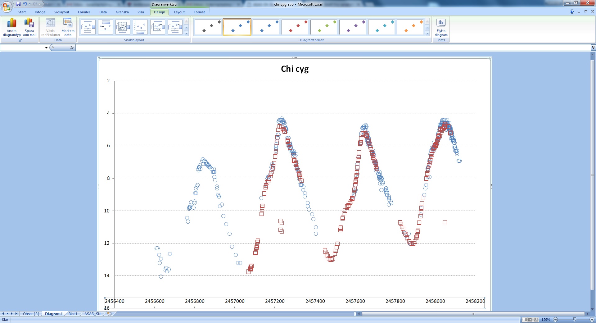Kunde inte riktigt släppa detta med ASAS-SN-data och hur de är egentligen. Kvaliteten utmed de olika intervallen. Z UMa kanske var ett bra slumpval..för när jag valde Chi cyg så får jag en löjligt snygg kurva, typ "fixad"? Figuren är inte perfekt pga för mig ny excel-version (och lyckades inte ens beskära den då jag inte har mitt kära irfanview på denna dator...men jag tror ni förstår bilden ändå) jag inte kan så bra men Blåa är iaf SVO-obsar och röda är punkter från ASAS-SN-data för chi cyg.