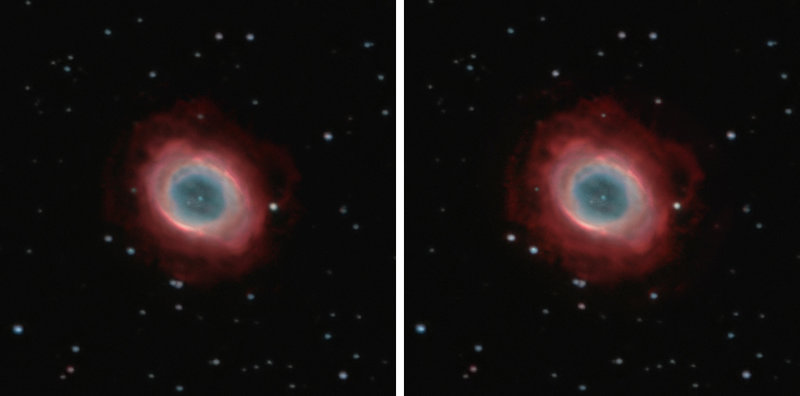 Den här gången tog jag ut bara den röda kanalen i H-alfa subbarna och stretchade dessa lite redan innan alignment/registrering och stackning. Sedan stretchade jag ytterligare och blandade in detta i den röda kanalen på version 1, det blev en hel del labbande här.