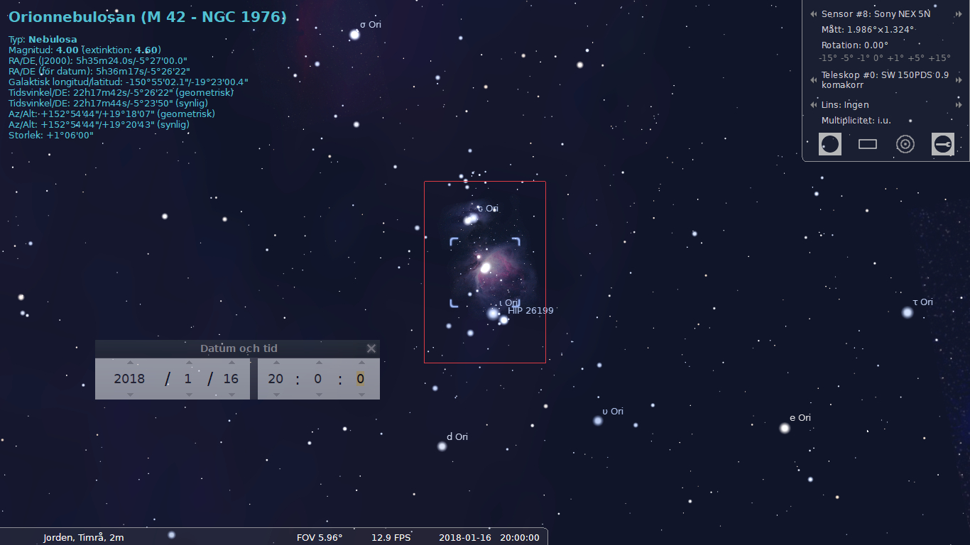 Jag har roat mig med att göra ett exempel från nu kl 20:00 i kväll. Himmelsobjekt M42. Listnumreringen här följer listan i mitt inlägg tidstämplat 2018-01-16 12:39:08: