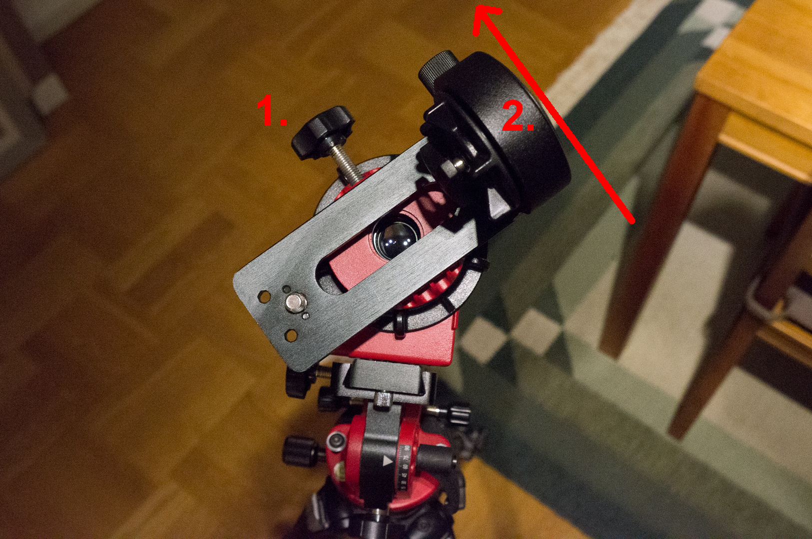 Och så en praktisk detalj så man får skalorna vridna så att de går att avläsa. Orientera låsratten (1) som låser fast L-bracketen (2) på polaxeln enligt nedan bild. Dels orienteringen i förhållande till StarAdventurerns egna hus, och dels orienteringen gentemot L-bracketen. Fäst objektivet/teleskopet till höger på L-bracketen med optiken pekande i pilens riktning. Det hela kan förhoppningsvis undvika en del förvirring men jag har inte provat allt så mycket själv än att jag kan säga om det är idiotsäkert. Rätt vad det är står man väl där i mörkret och kliar sig i huvudet hur allt detta egentligen skall gå ihop beroende på vart på himlen man kommer på att peka teleskopet: