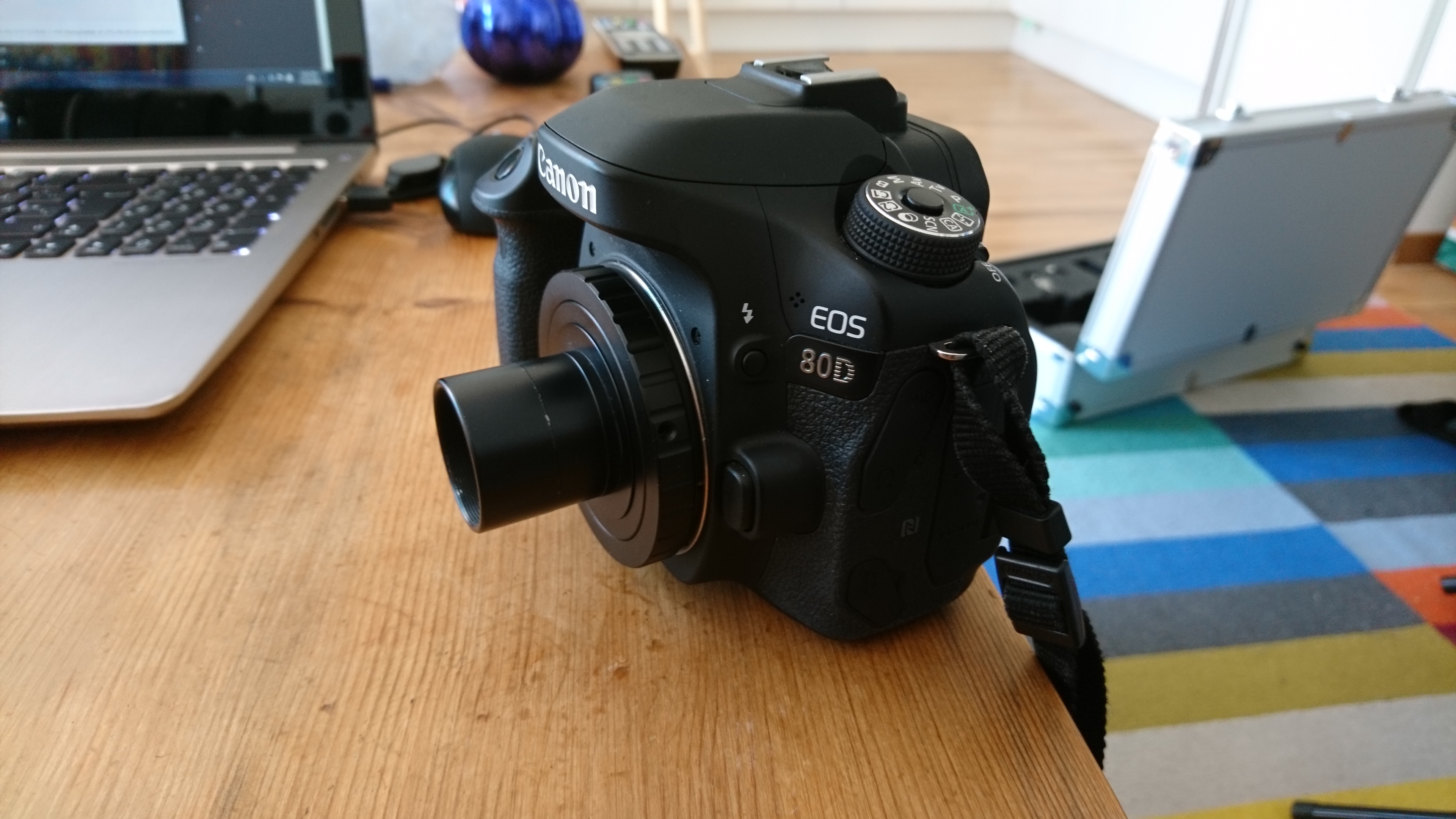 FYI: Upptäckte precis att diagonalen har en T2 gänga, så att man kan skruva fast kameran direkt i diagonalen utan 1.25 tums adaptern. Osäker om det räcker för fokus.