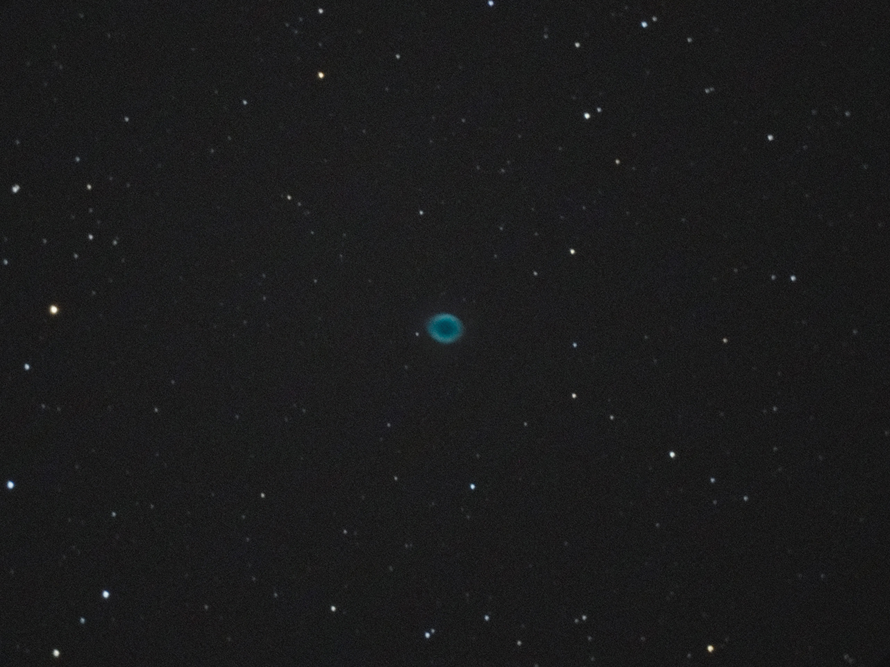 Med teleskopet i alt-azimutalläge fäste jag kameran med en 1,25" adapter i diagonalen, då skulle den åtminstone gå fri från monteringen, ställde fokus på Vega och centrerade sedan på M57 och tog en serie exponeringar på 5, 10 och 20 sekunder vid 12.800 Iso. Döm om min förvåning när ungefär hälften av exponeringarna även på 20 sekunder såg fina ut. Som med alla SCT så är inte bildfältet plant utan bara de centrala delarna är skarpa och med en fullframe kamera blir det givetvis mycket vignetering.