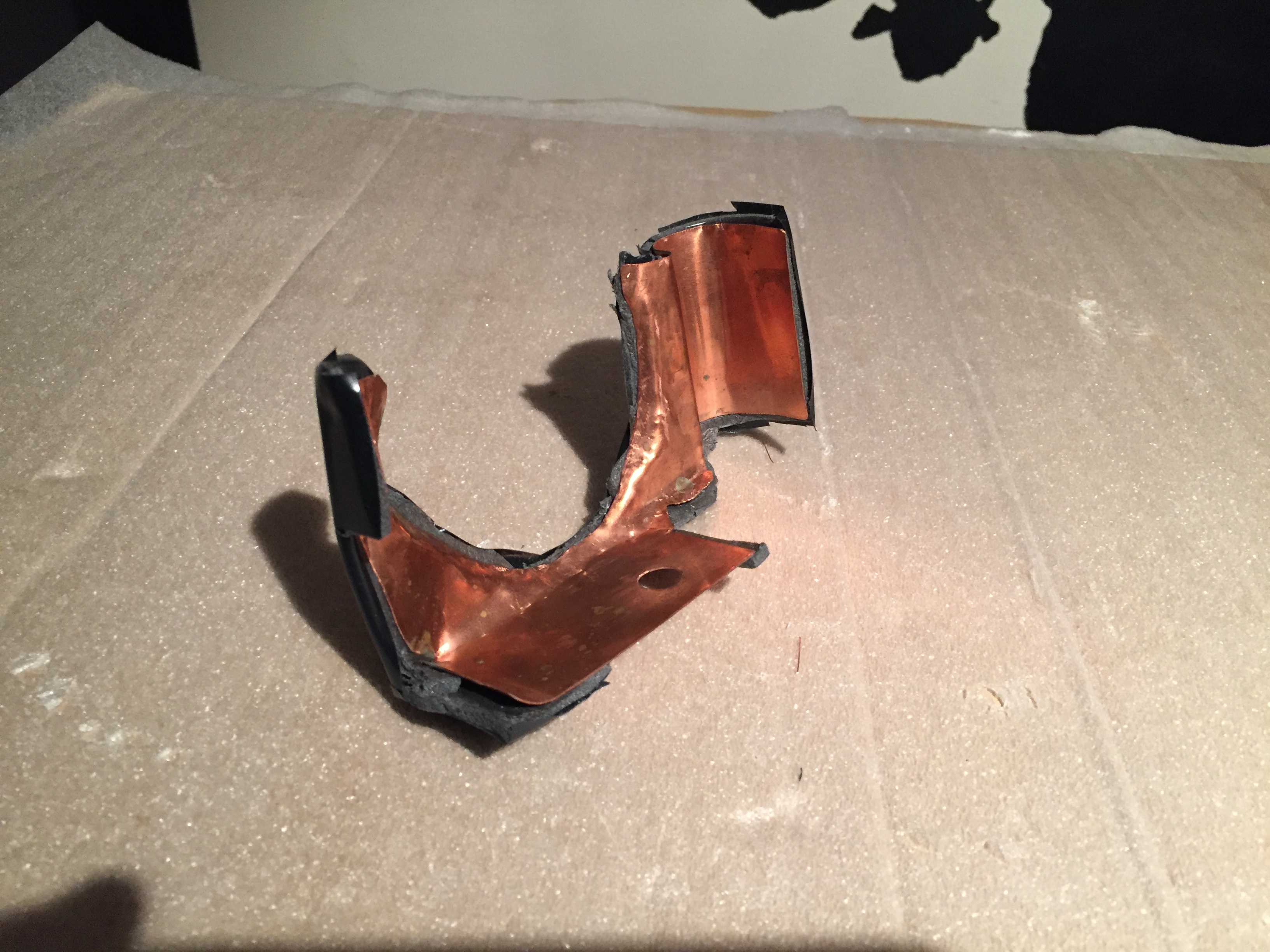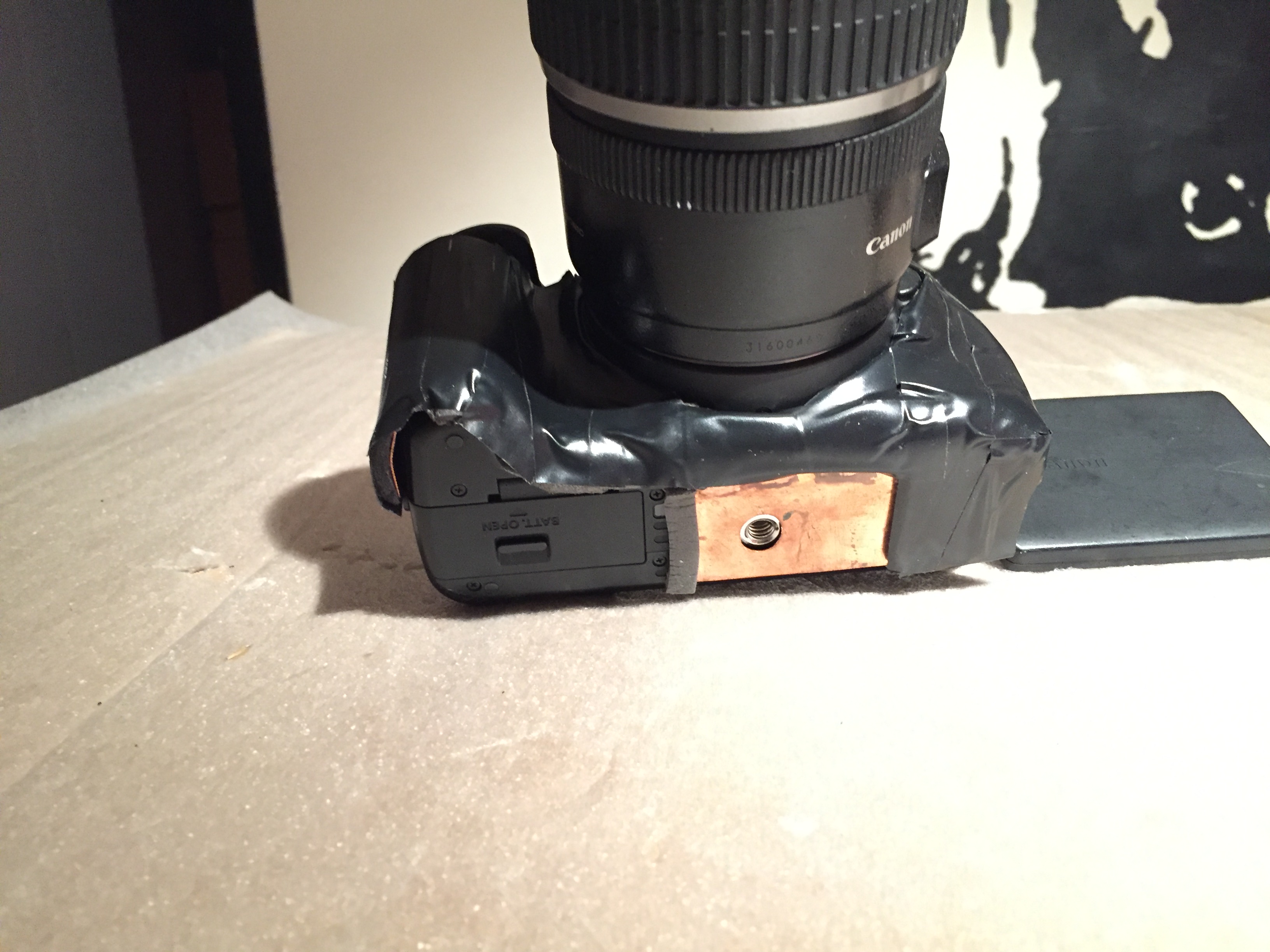 Tunn kopparplåt (0,5mm tror jag). Inköpt på bauhaus, och hamrad för att passa kameran och ge extra yta som kyler.