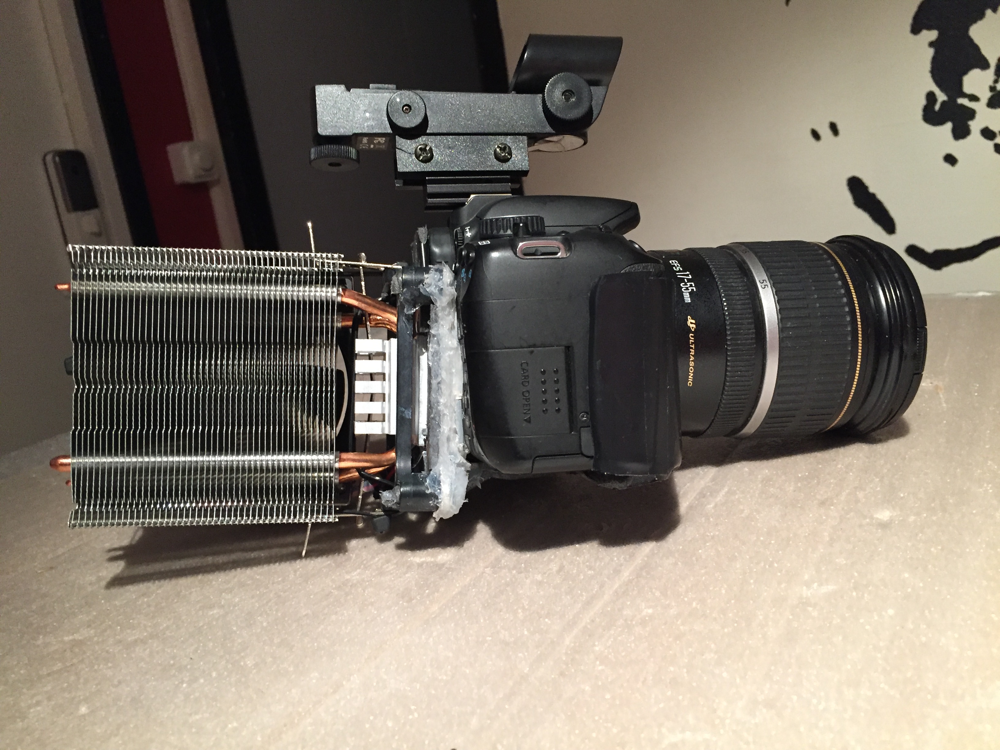 Hej! Har lovat att lägga upp lite information om kamerakylningen jag byggt till min 650D. Har utgått från samma principer som beskriv i denna video, men har fått göra stora förändringar för att nå de resultat som denna killen påstår är möjliga. Kylflänsen som föreslås här är inte i närheten tillräckligt stor för att kyla peltier elementet. Har också kommit fram till att det är helt onödigt med reglering då det bara handlar om att försöka kyla så mycket som möjligt för att det ska ge någon effekt på sensorn innanför plasten.