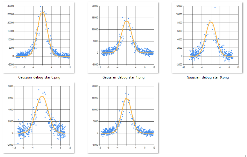 När det gäller FWHM så kan man tex ta de pixlar som ligger horisontellt utmed stjärnans mittposition, men då använder man ju inte all information i bilden. Andra produkter som tex Mira Pro gör en radial profile + gaussian curve fitting för att estimera FWHM. Jag använder också alla pixlar, men har hittills fuskat med curve fitting. Jag kör en mindre exakt, men snabb approximation istället.