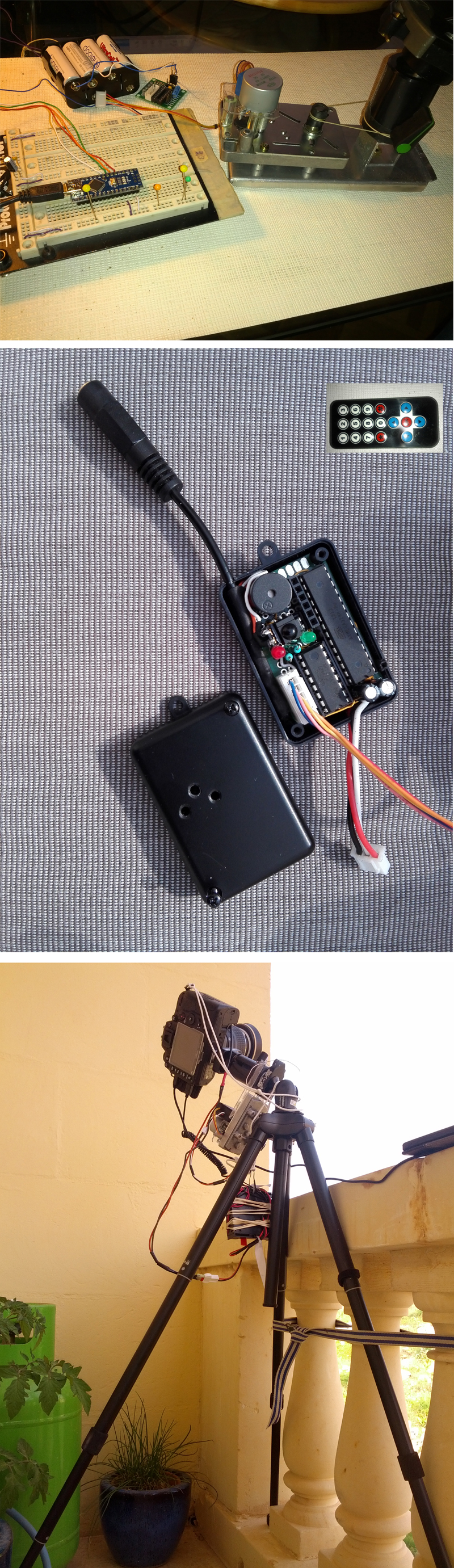 Arduino-mojen däremot funkade felfritt. Den styr både stegmotorn och kameran, med en IR-fjärrkontroll som interface. En liten växellåda är inbyggd i stegmotorn, sedan hittade jag en överbliven större växellåda (fick modifieras lite) som slutväxel. Men detta är bara en prototyp, jag kommer att jobba vidare med en annan (remdriven) design.