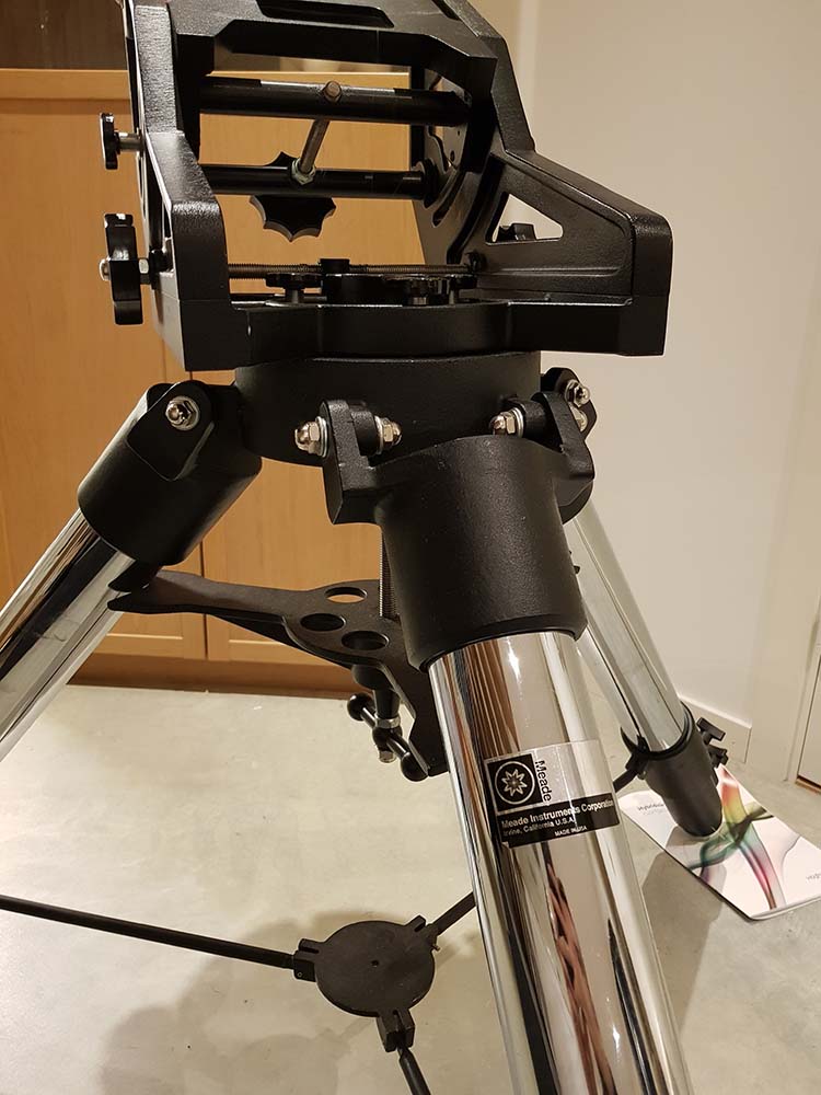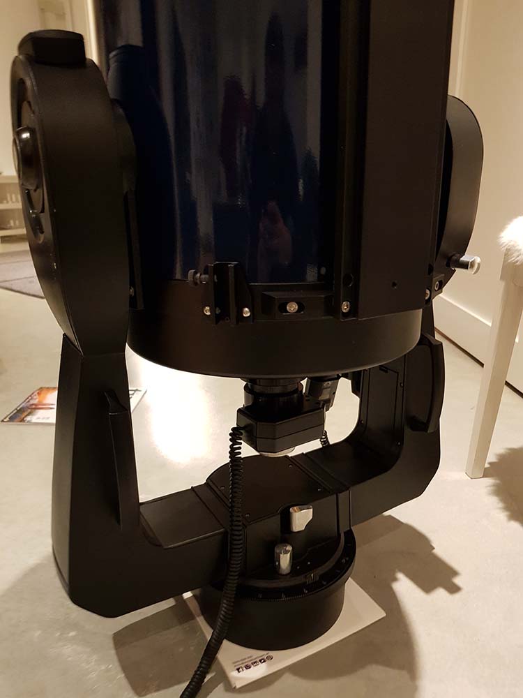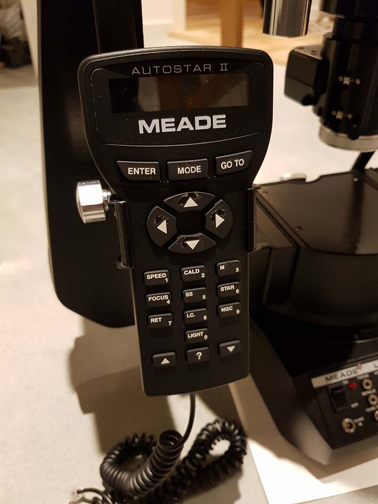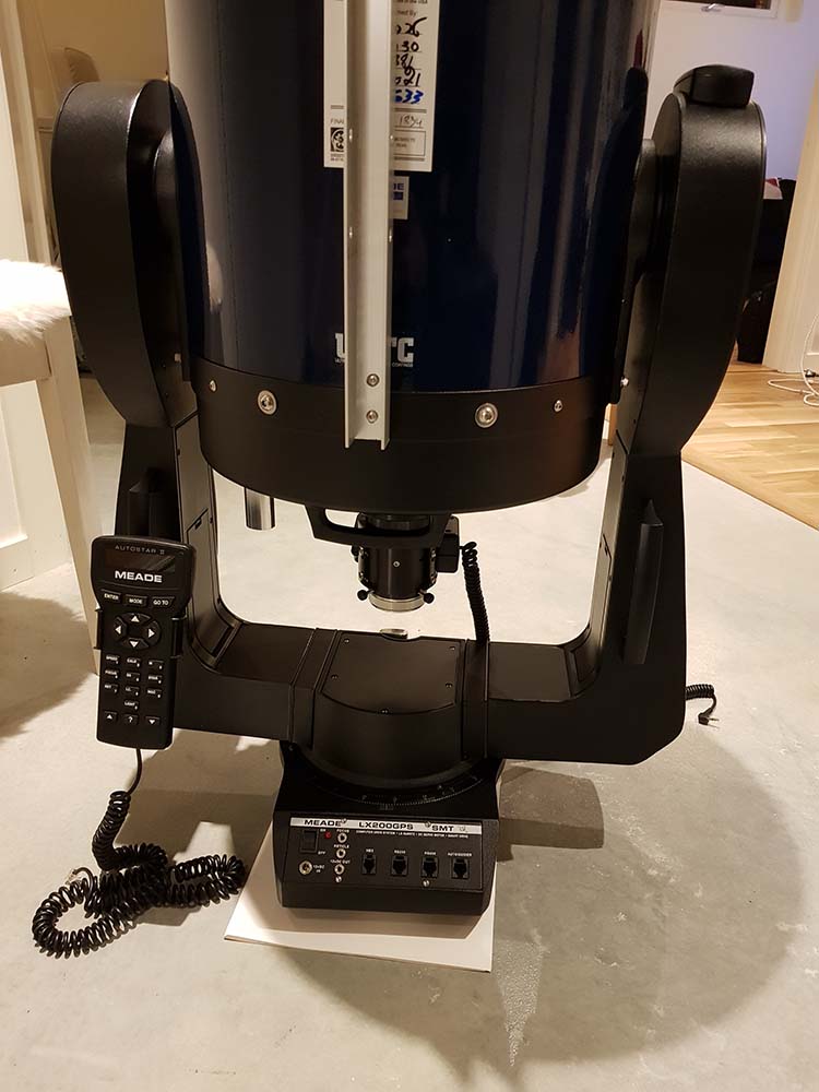 Detta är en gaffelmontering gjord för att hålla en stor optik så grejerna är tunga och stabila. GPS och Goto-funktion genom Autostar II-handkontrollen med ~120000 objekt förinprogrammerade. Drivs med 8st vanliga batterier eller med nätström (kabel medföljer).