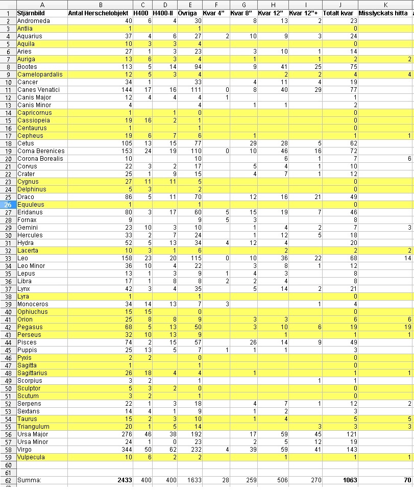 De gulmarkerade raderna anger antingen att jag har sett alla objekt i stjärnbilden eller att jag har letat med 12" men inte har hittat alla objekt. Några stjärnbilder som Leo, Corona Borealis, Gemini och Serpens har jag börjat med men är inte klar.