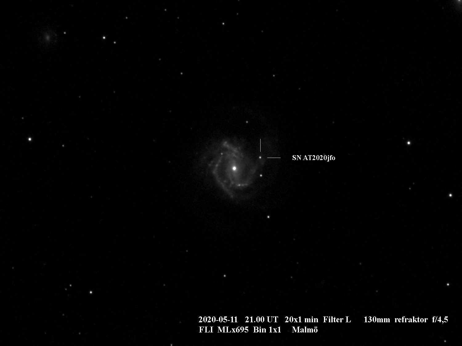 Jag hann precis observera supernovan i M61 inatt innan sommarljuset tar över. Kl 1:05 (april 11.96 UT) skattade jag SN2020jfo till magnitud 14.1. Först trodde jag att galaxens kärna av 12 magnituden var supernovan men sedan såg jag att den var diffus. Därefter såg jag tre stjärnor i rad väster om galaxens kärna där den nordligaste av dem var supernovan. Med 12-tums Dobson och 300x förstoring var SN2020jfo mycket svår att urskilja när det var som mörkast (solhöjd -12°). Det var den sista natten med "nautiskt mörker" hos mig på latitud 60° N. I år har jag redan sett 8 nya supernovor vilket är det flesta något år. Det var även första gången som jag sett en ny supernova en majmånad. Jag hade förresten sett en supernova tidigare i M61, SN2008in, som jag skattade till magnitud 14.5 på nyårsafton 2008 med min gamla 10-tums Dobson.
