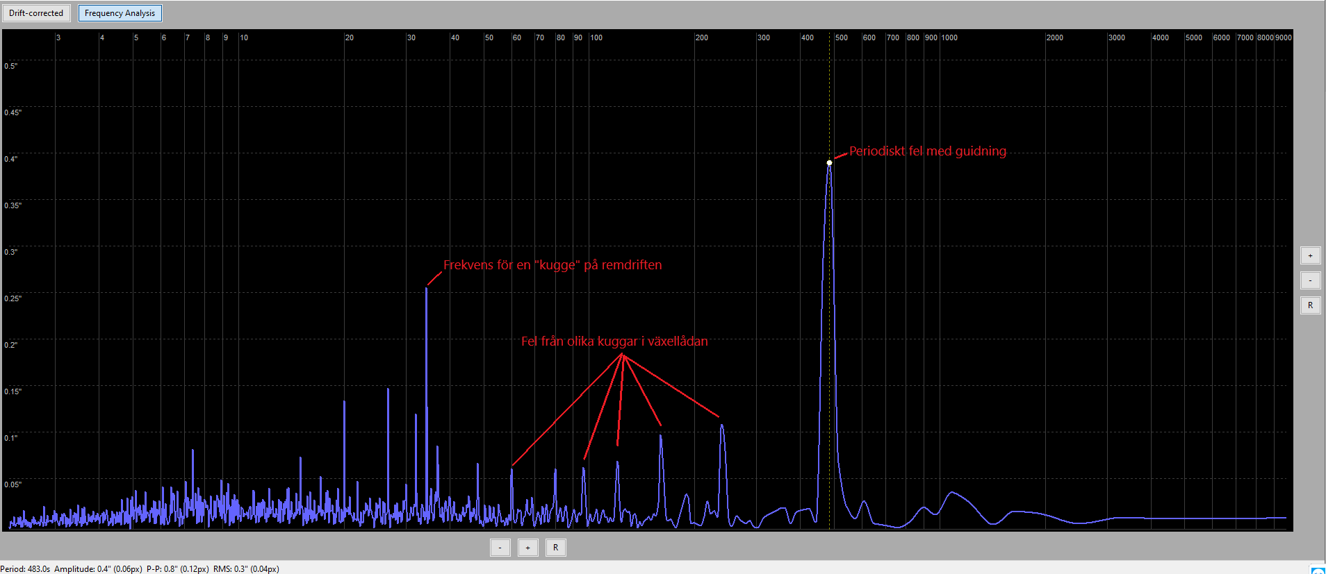 Bifogar några bilder från en guide log. Bild 1 visar en typiskt "halvkass" session med min montering över ett varv på skruven i snäckväxeln. Bild 2 visar samma kurva fast här har analysprogrammet lagt till guide pulserna för att visa hur felet hade sett ut utan guidning. Här syns min PE tydligt, så PHD tar hand om det mesta. Bild 3 visar en frekvensanalys av totala felet av 2 timmars guidning. Trots att PHD gör ett bra jobb så bidrar PE med en hel del.