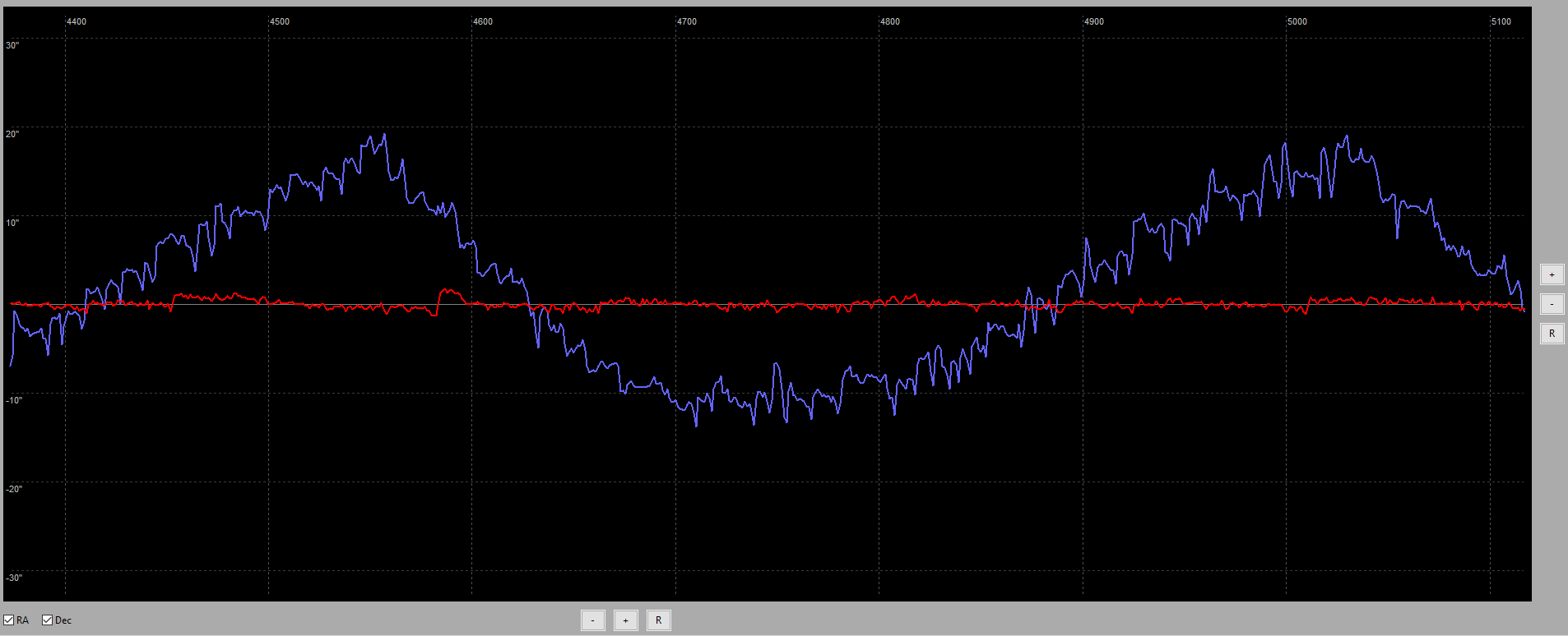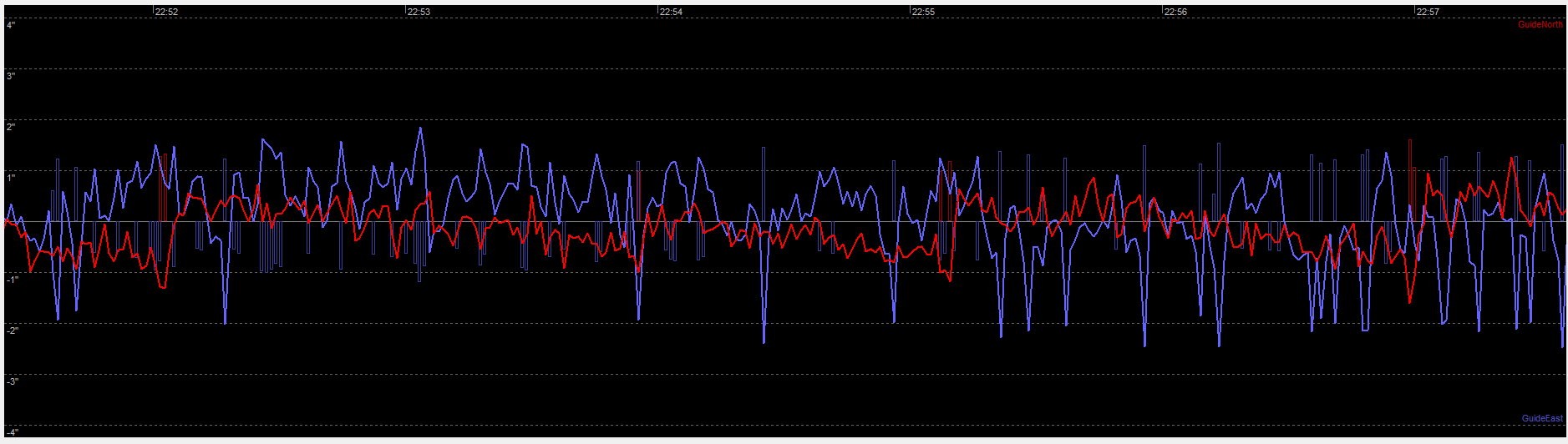 Är dock fundersam på hur mycket det har med seeing att göra. I mitt fall verkar det mer bero på hur monteringen mår för dagen + vind. Har du kollat dina loggar från PHD? Upptäckte nyligen PHD2 Log Viewer, där kan man se hur mycket dit periodiska fel och högfrekventa fel från t.ex. växelådor tillför till din totala rms.
