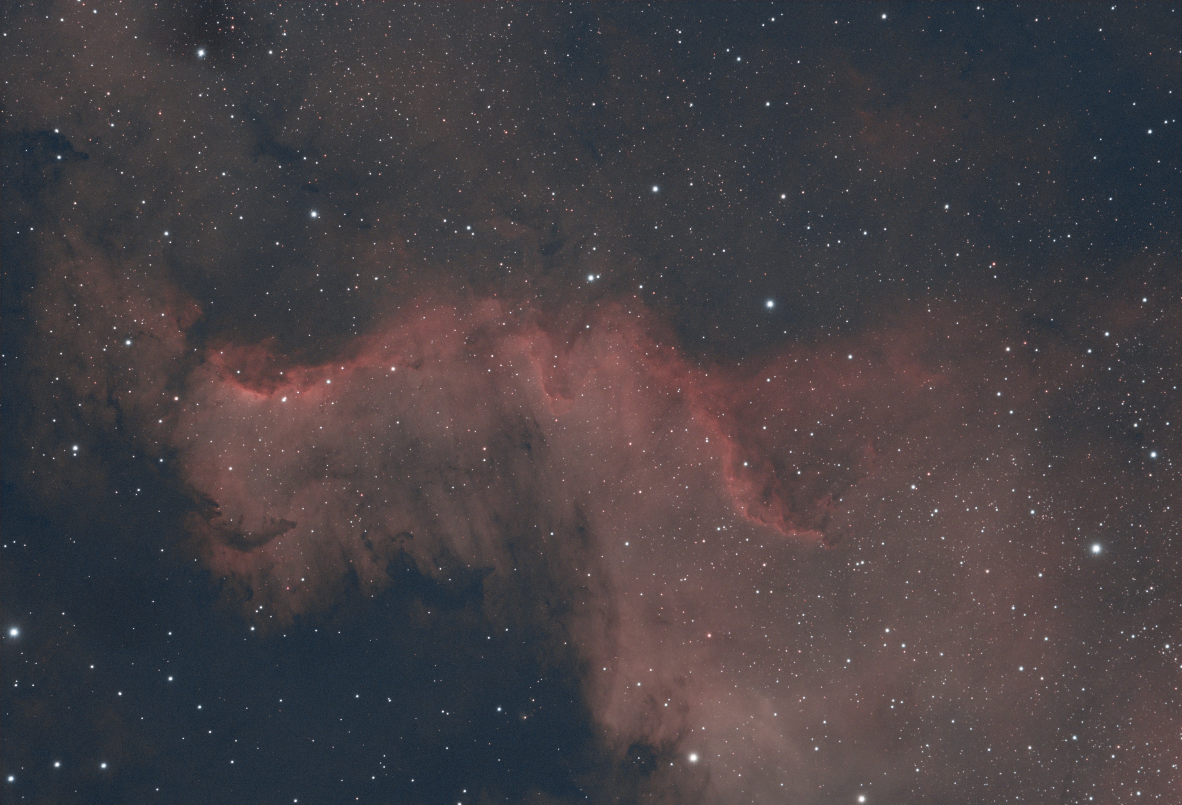 Hade själv förväntat mig liiite mer detaljer och skärpa/kontrast och mindre brus kanske. Men har för mig at NGC7000 är lite knepig och ljussvag sedan tidigare försök. 150min kanske är för lite för att få till något vettigt?