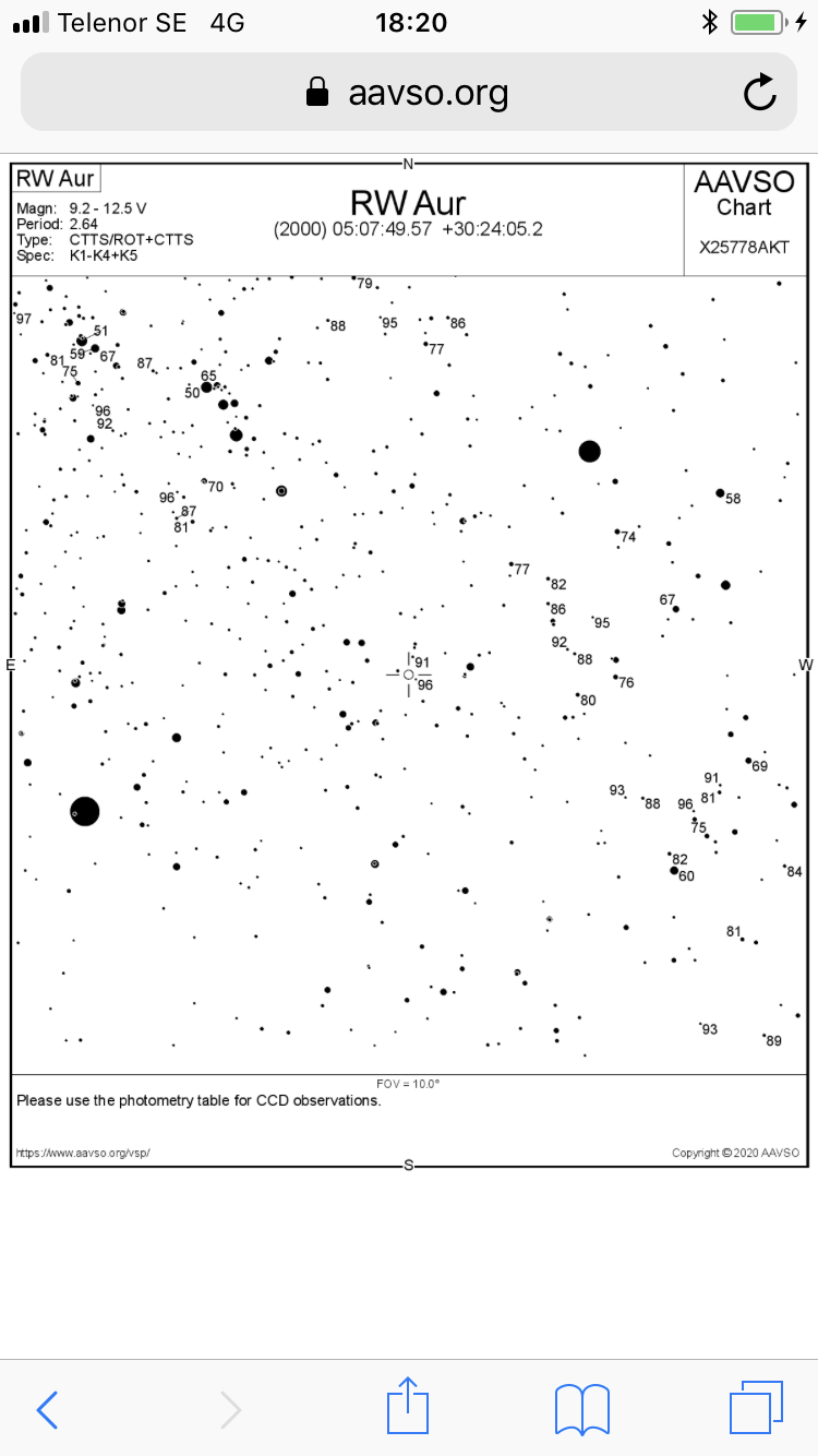 Jag passar på att lägga in två kartor för RW Aur, båda har norr uppåt. Den övre omfattar 10x10 grader, den nedre 30x30 bågminuter. Lägg märke till stjärnorna 91 och 96 som finns utmärkta på båda kartorna.