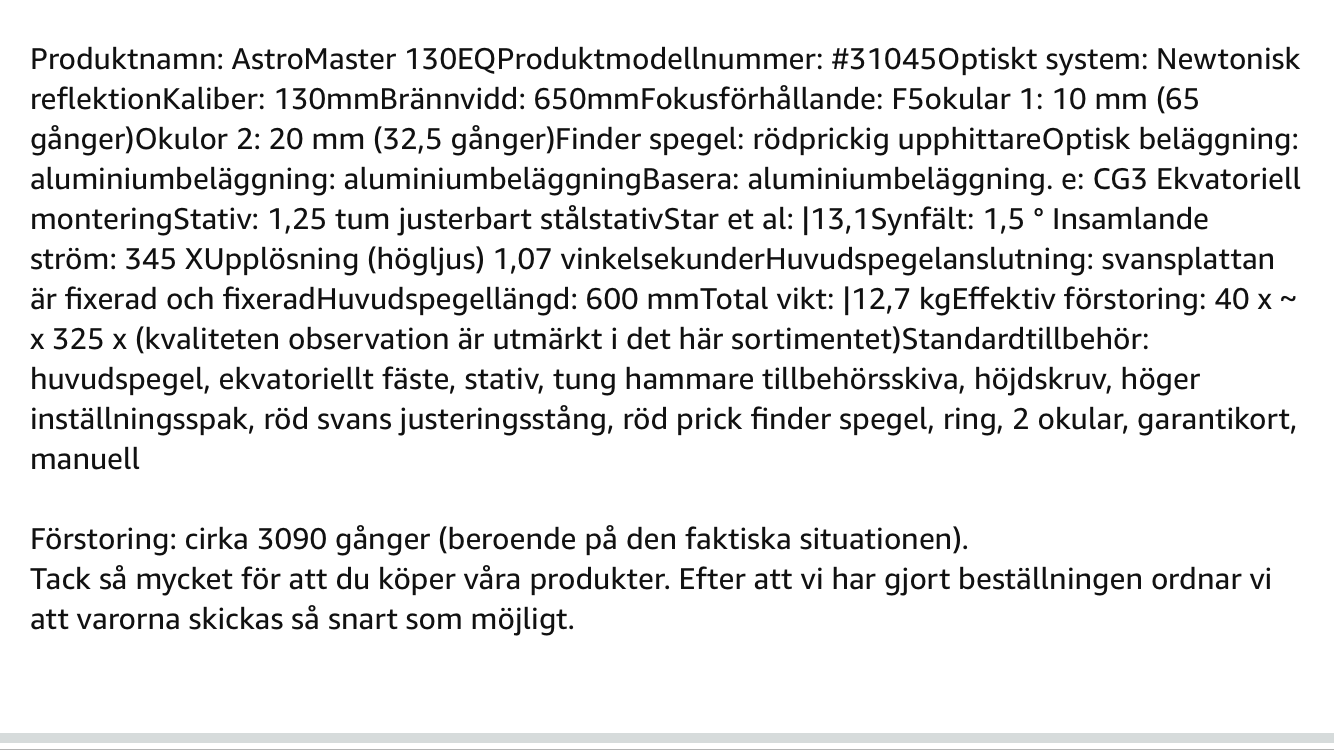Man kan från Amazon köpa en Astromaster 130EQ för det facila priset 14706 SEK. Normalpris ca 3000 SEK. Å andra sidan sägs detta exemplar klara 3090 gångers förstoring ...
