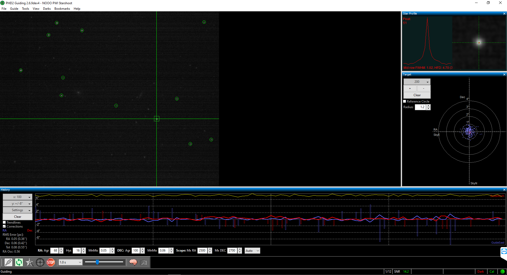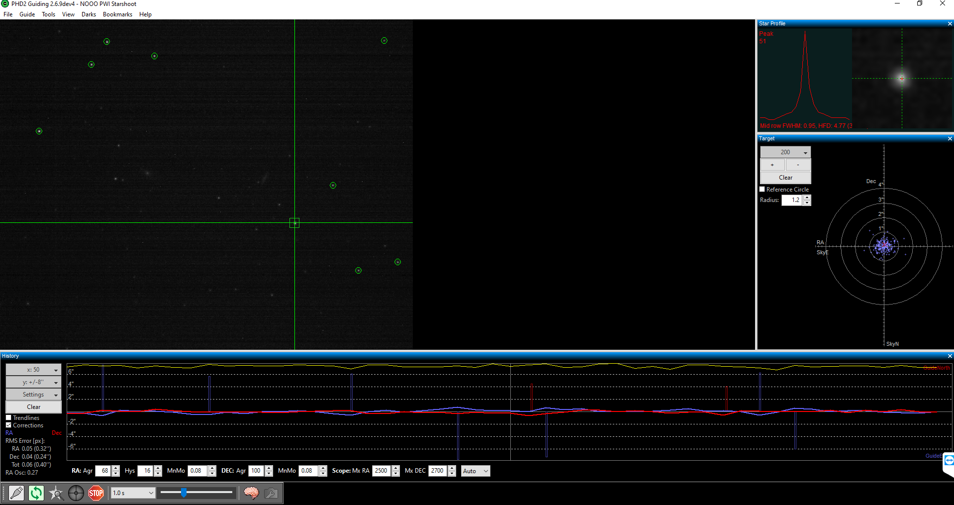 Har gjort ett första test med PHD multistar guiding. Det finns en dev4 release som jag rekommenderar alla att testa. Själv har jag haft lite problem med att jag inte kunnat köra längre guide exponeringar (>1,5s) för att min montering ibland hoppar till plötsligt. Med 1 sekunders exponeringar klarar phd att ta hand om det hyffsat bra. Nackdelen är då att seeing börjar påverka mätningarna av positionsfelet.