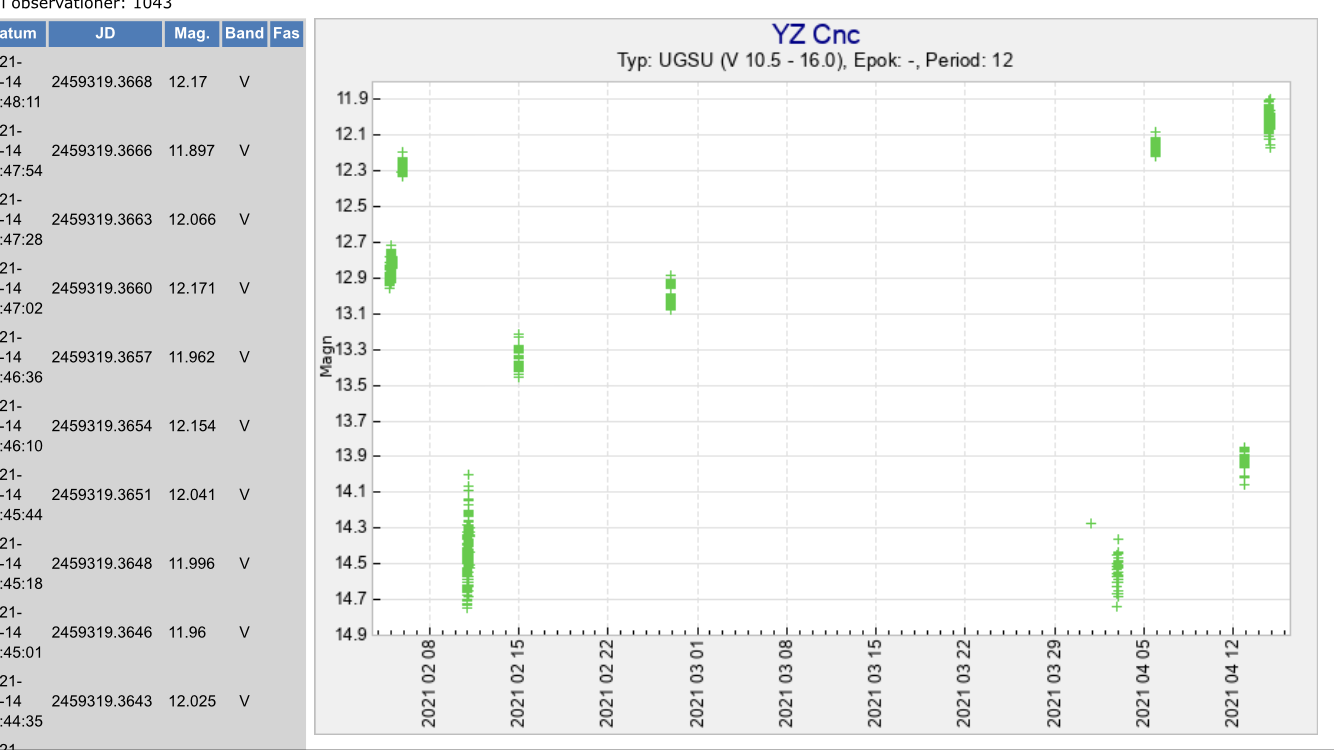 Magnus Larsson har under de senaste månaderna producerat nio tidsserier av YZ Cnc. Dessa ses i den övre översiktliga bilden nedan.