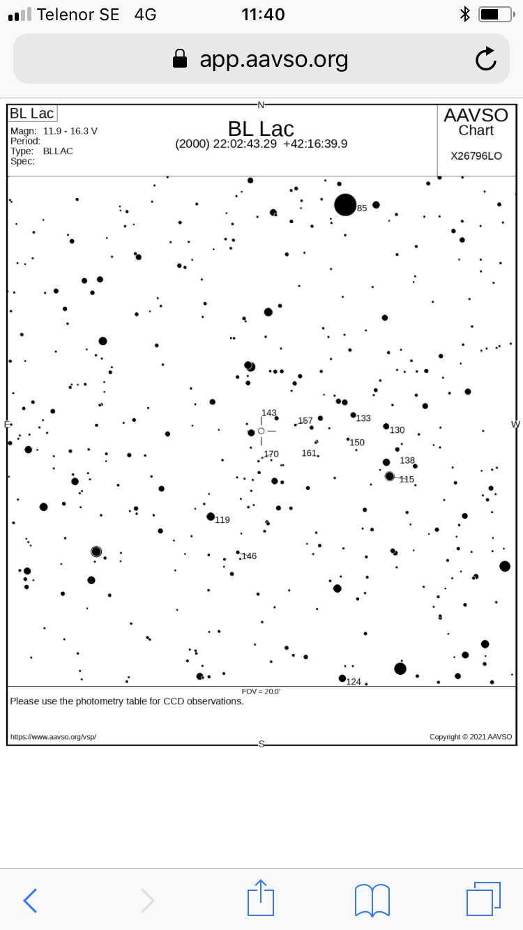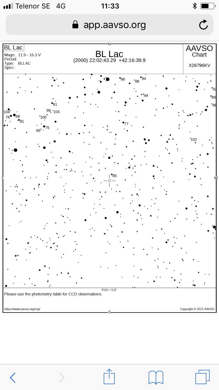 Jag slänger in ett par AAVSO-kartor nedan, båda har norr uppåt. Den övre omfattar 5x5 grader, den undre 20x20 bågminuter. Lägg särskilt märke till 85-stjärnan som finns på båda kartorna.