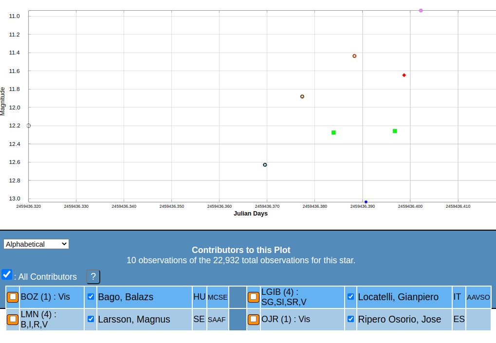 Jag lyckades mäta den igårkväll i en lucka i molnen, se nedanstående (min obs är den sista där i BVRI):