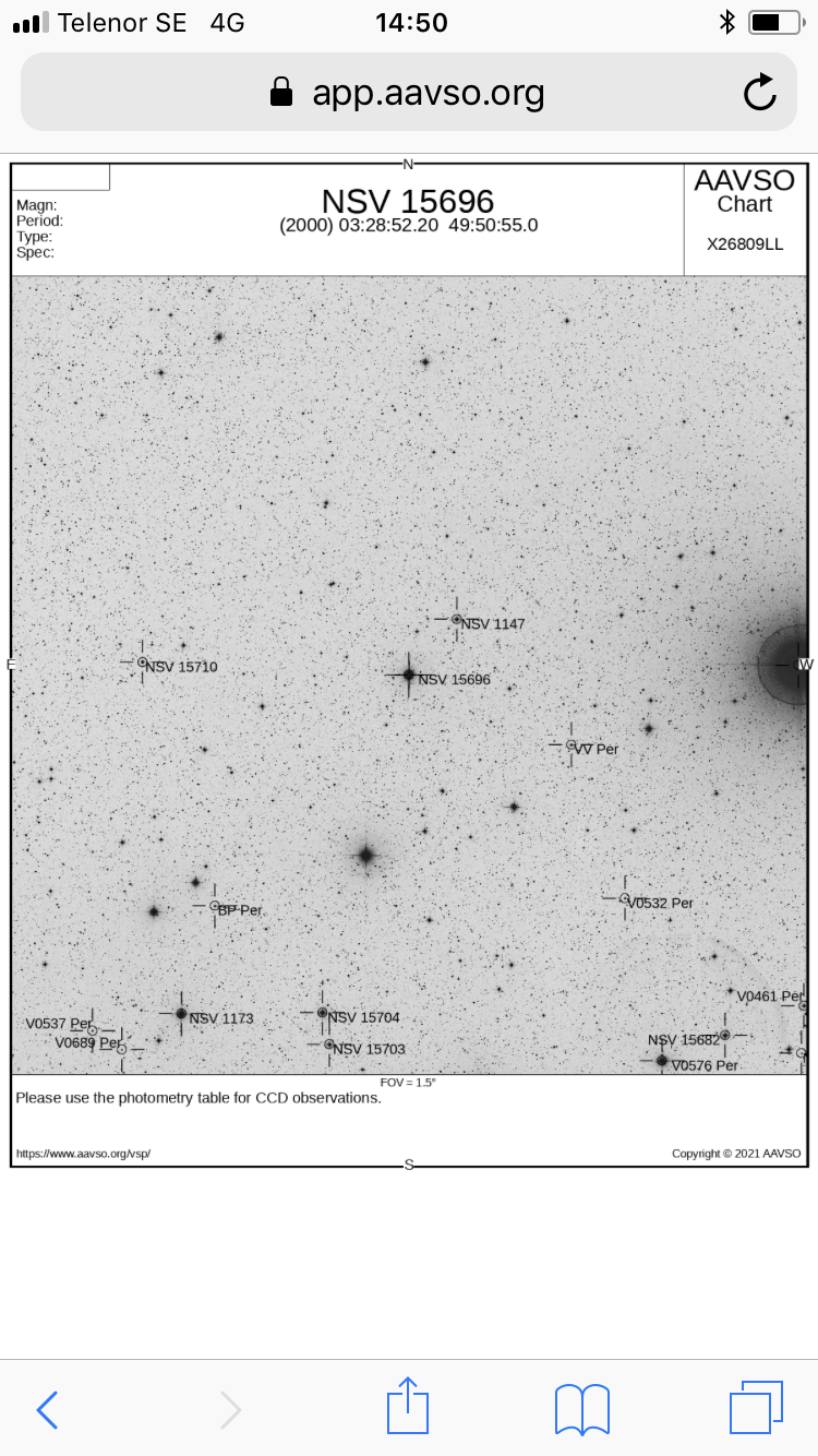 Så snart jag får klartecken från Andreas att låna en bit av hans bild så lägger jag den här nedan. Tills vidare ger jag AAVSO-kartor med och utan foto. Norr uppåt, utsnitt 1.5 grader. Den mycket ljusa stjärnan i högerkanten är Alfa Persei.