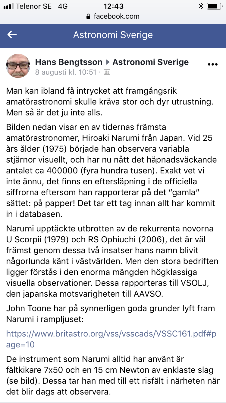 När jag skrev om Namuri och nämnde hans upptäckt av utbrottet 2006 så bör alltså RS ha varit av magnitud 10 och ljusnande i raketfart, för första gången på 15 år. Vilken konstig slump är inte det, jag har liksom inte för vana att skriva om RS Ophiuchi.
