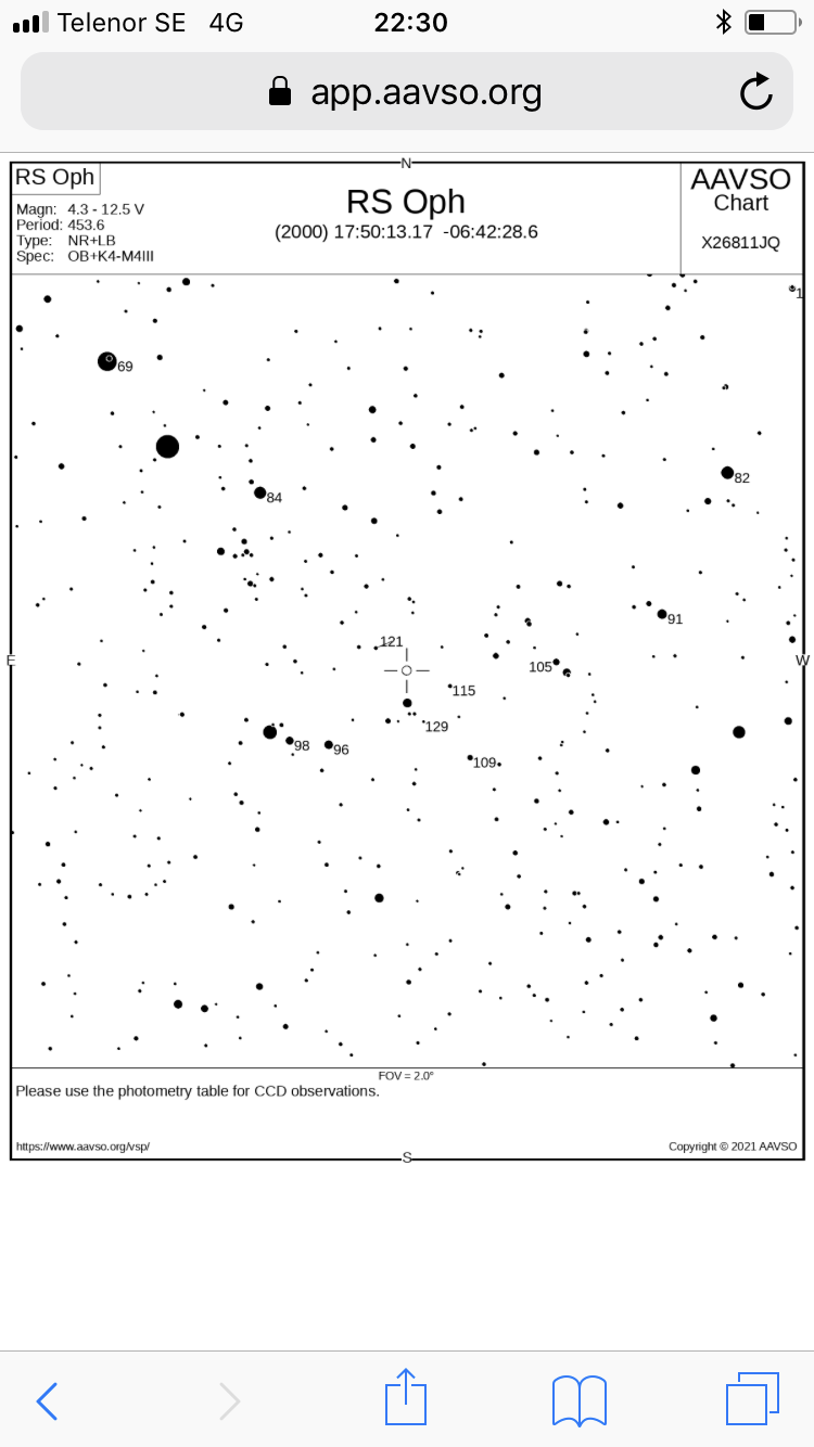 Jag tog en ny bild av RS Oph 200821 (efter min första bild från 0813 som finns i Atsrofotograferingsforumet). En stark fullmåne gjorde att jag inte kom ned till lika svaga stjärnor, men RS Oph var förstås inga problem. Jag skattade den till något starkare än mag 8, men jag är inte så van att bedöma magnituder, så det är ingen uppskattning att lita på. Dock stämmer den bra med de på AVSOO publicerade magnituderna. Bild bifogas. Exponering: 79x1s, Canon EOS 6D, 200mm, f/2,8.