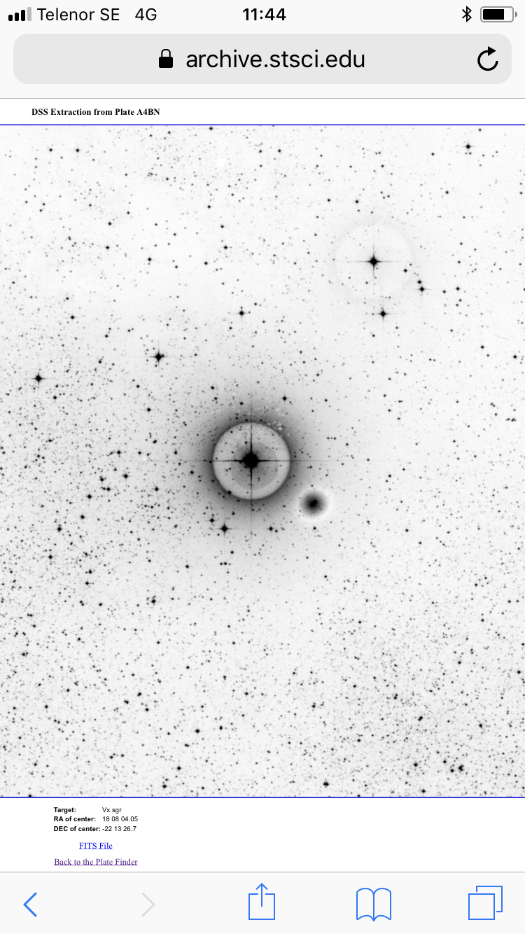 Nedan två IR-bilder från DSS. På den ena finns en märklig blaffa nere till höger om VX Sgr. Orsakad av överstrålning från VX Sgr?