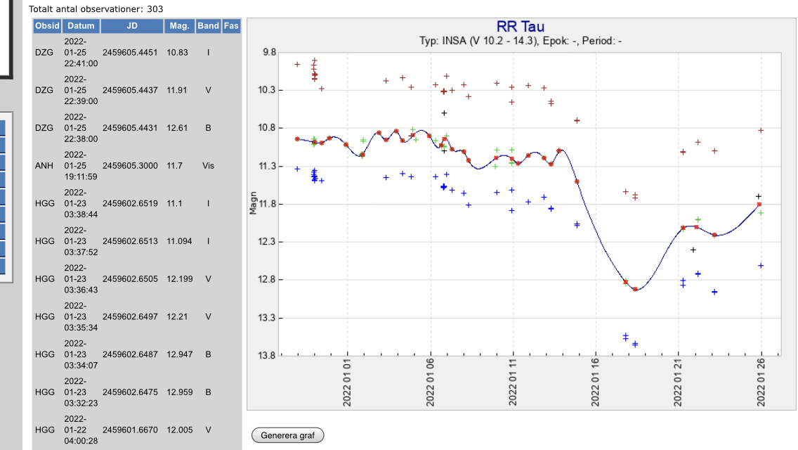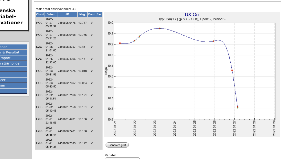 Den 25 januari finns två obsar i SVO som ser mysko ut: B-mätningen av UX Ori och R-mätningen av RR Tau. Tror det blivit någon förväxling där?