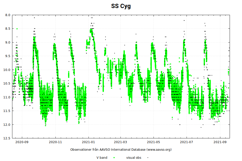 SS Cyg är i utbrott (enligt Magnus L:s senaste mätningar). Man får intrycket av att stjärnan går sakta tillbaka till sitt "normalt" beteende.