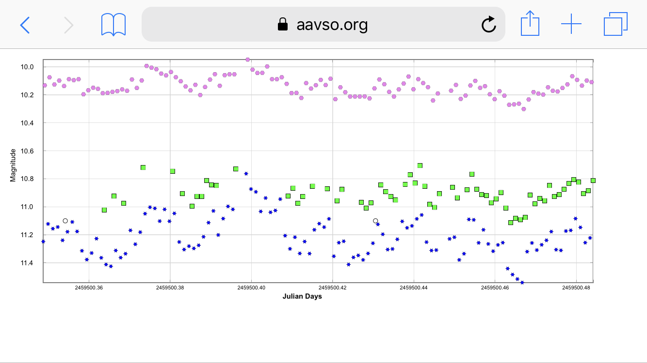 Nedan ses Magnus BVI-mätningar av SS Cyg kvällen den 7 oktober. Oscillationernas amplitud är större i kortare våglängder än i längre våglängder.